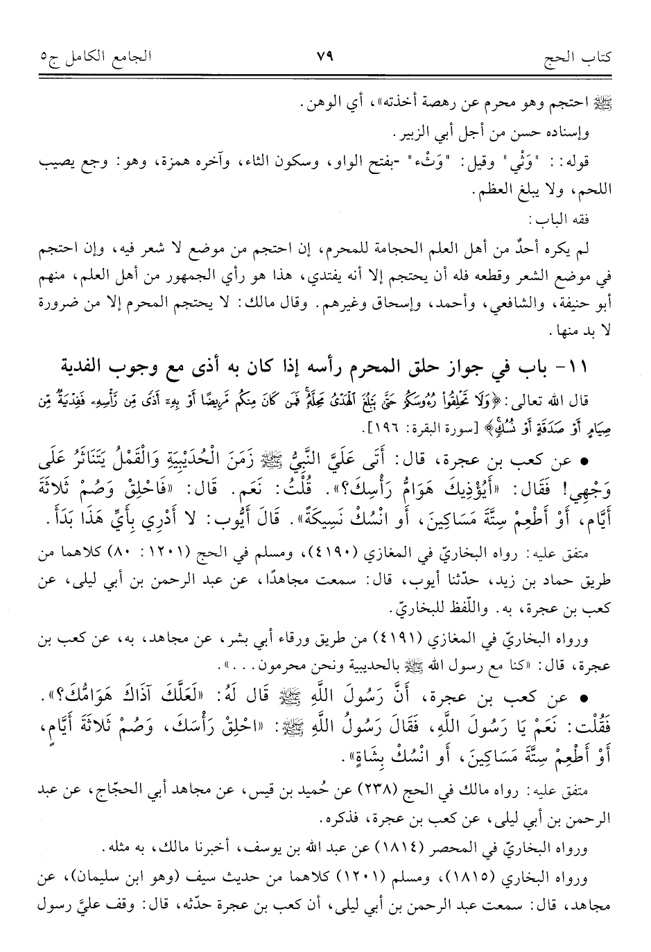 • عن كعب بن عجرة، قال: أَتَى عَلَيَّ النَّبِيُّ - صلى الله عليه وسلم - زَمَنَ الْحُدَيْبِيَةِ وَالْقَمْلُ يَتَنَاثَرُ عَلَى وَجْهِي! فَقَال: "أَيُؤْذِيكَ هَوَامُّ رَأْسِكَ؟ ". قُلْتُ: نَعَم. قَال: "فَاحْلِقْ وَصُمْ ثَلاثَةَ أَيَّام، أَوْ أَطْعِمْ سِتَّةَ مَسَاكِينَ، أَو انْسُكْ نَسيِكَةً". قَالَ أَيُّوب: لا أَدْرِي بِأَيِّ هَذَا بَدَأَ.