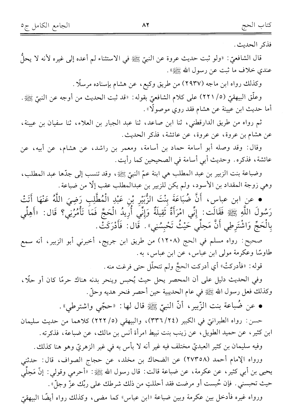 • عن ابن عباس، أَنَّ ضُبَاعَةَ بِنْتَ الزُّبَيْرِ بْنِ عَبْدِ الْمُطَّلِبِ رَضِيَ اللهُ عَنْهَا أَتَتْ رَسُولَ اللهِ - صلى الله عليه وسلم - فَقَالَت: إِنِّي امْرَأَةٌ ثَقِيلَةٌ وَإِنِّي أُرِيدُ الْحَجَّ فَمَا تَأْمُرُنِي؟ قَال: "أَهِلِّي بِالْحَجِّ وَاشْتَرِطِي أَنَّ مَحِلِّي حَيْثُ تَحْبِسُنِي". قَال: فَأَدْرَكَتْ.