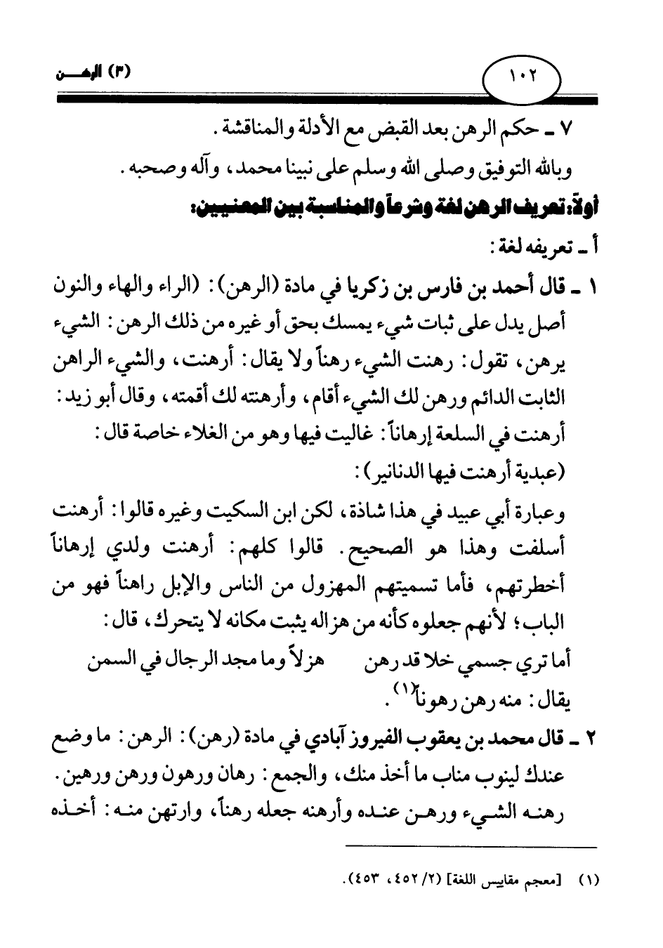1 - قال أحمد بن فارس بن زكريا في مادة (الرهن) : (الراء والهاء والنون أصل يدل على ثبات شيء يمسك بحق أو غيره من ذلك الرهن: الشيء يرهن، تقول: رهنت الشيء رهنا ولا يقال: أرهنت، والشيء الراهن الثابت الدائم ورهن لك الشيء أقام، وأرهنته لك أقمته، وقال أبو زيد: أرهنت في السلعة إرهانا: غاليت فيها وهو من الغلاء خاصة قال: