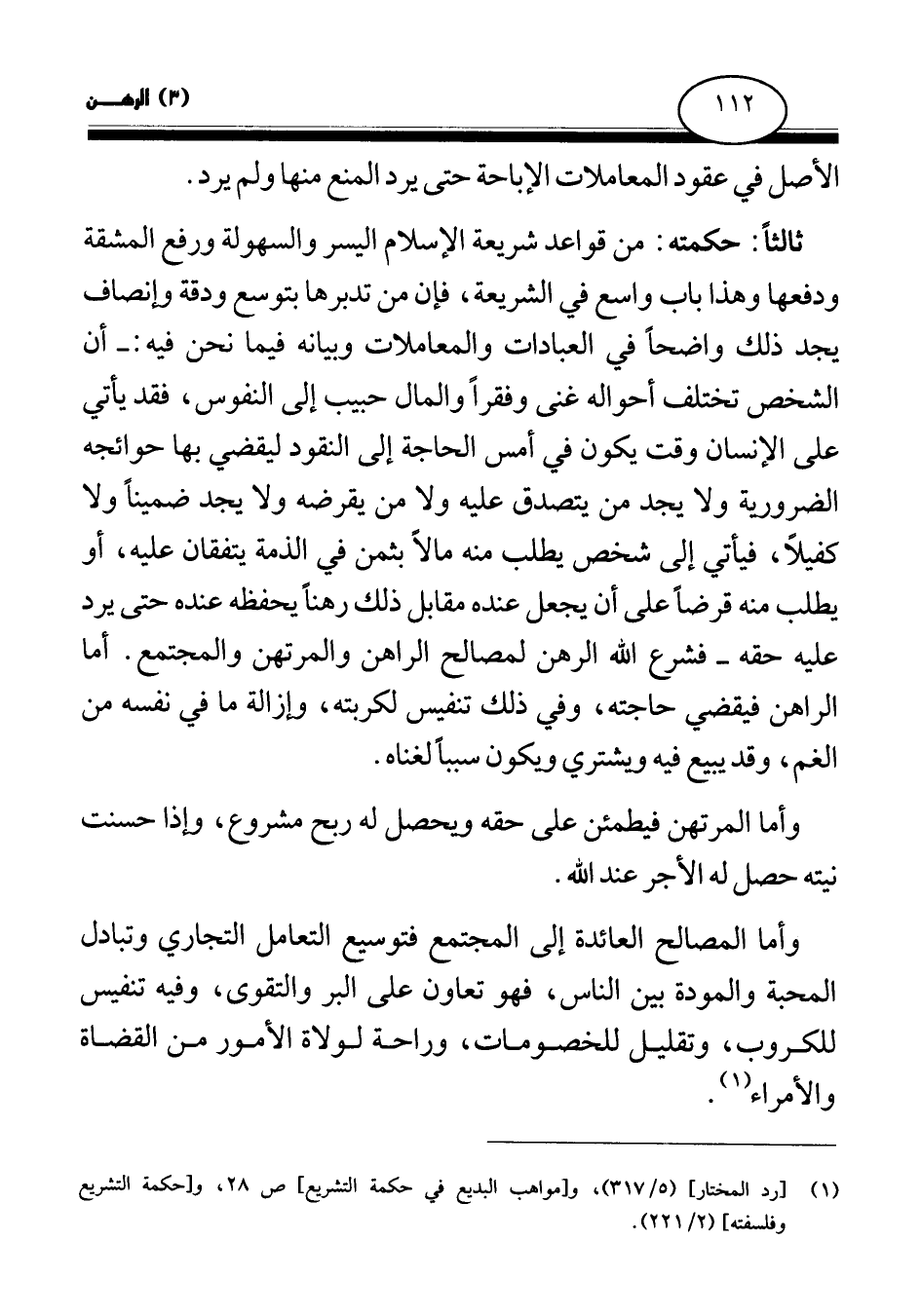 ثالثا: حكمته: من قواعد شريعة الإسلام اليسر والسهولة ورفع المشقة ودفعها وهذا باب واسع في الشريعة، فإن من تدبرها بتوسع ودقة وإنصاف يجد ذلك واضحا في العبادات والمعاملات وبيانه فيما نحن فيه: - أن الشخص تختلف أحواله غنى وفقرا والمال حبيب إلى النفوس، فقد يأتي على الإنسان وقت يكون في أمس الحاجة إلى النقود ليقضي بها حوائجه الضرورية ولا يجد من يتصدق عليه ولا من يقرضه ولا يجد ضمينا ولا كفيلا، فيأتي إلى شخص يطلب منه مالا بثمن في الذمة يتفقان عليه، أو يطلب منه قرضا على أن يجعل عنده مقابل ذلك رهنا يحفظه عنده حتى يرد عليه حقه - فشرع الله الرهن لمصالح الراهن والمرتهن والمجتمع. أما الراهن فيقضي حاجته، وفي ذلك تنفيس لكربته، وإزالة ما في نفسه من الغم، وقد يبيع فيه ويشتري ويكون سببا لغناه.