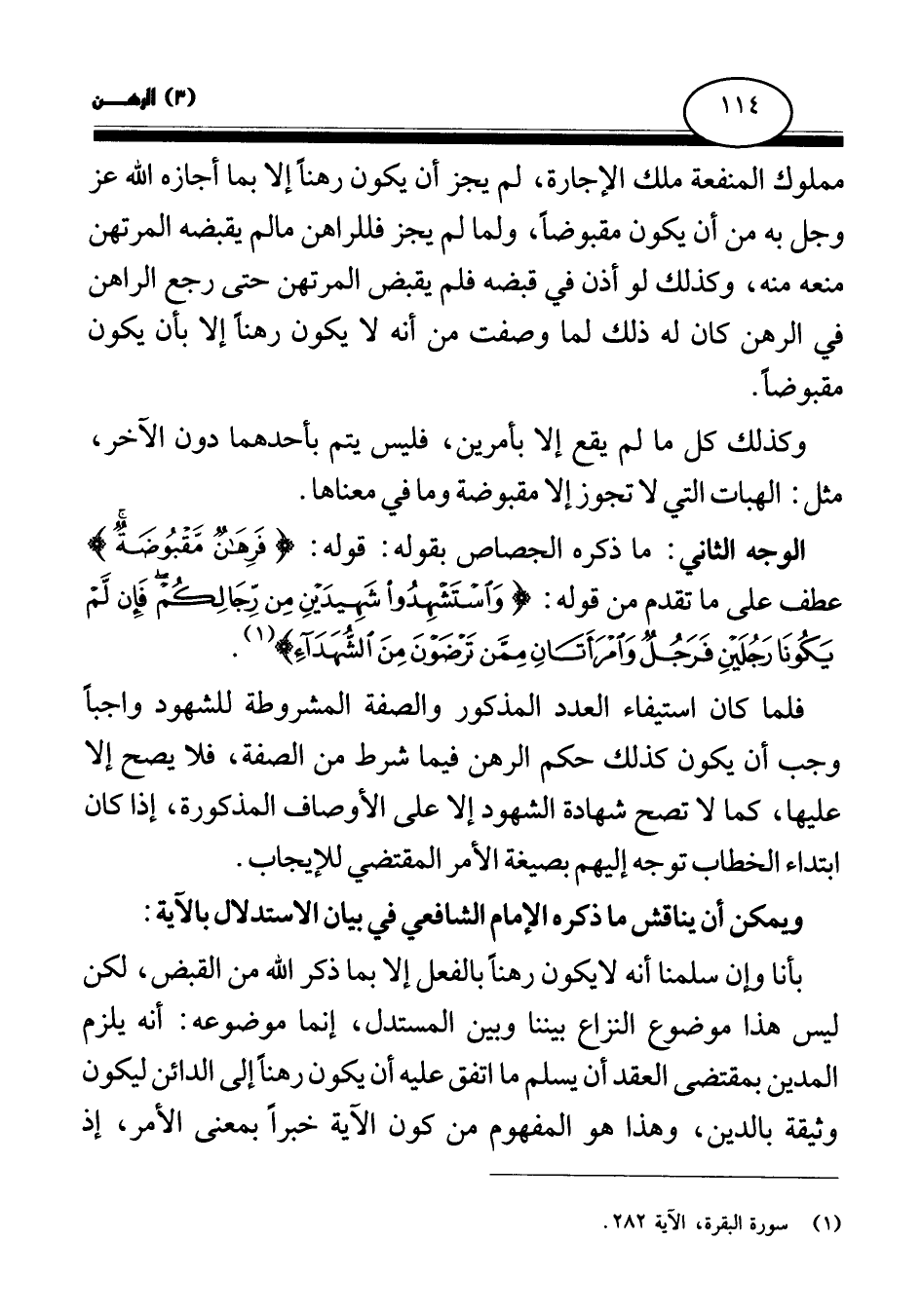 فلما كان استيفاء العدد المذكور والصفة المشروطة للشهود واجبا وجب أن يكون كذلك حكم الرهن فيما شرط من الصفة، فلا يصح إلا عليها، كما لا تصح شهادة الشهود إلا على الأوصاف المذكورة، إذا كان ابتداء الخطاب توجه إليهم بصيغة الأمر المقتضي للإيجاب.