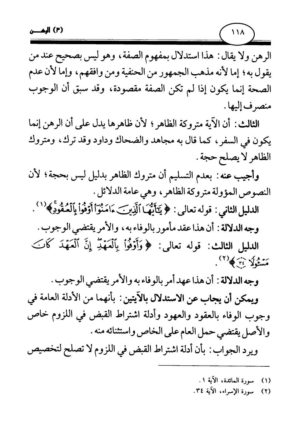 الرهن ولا يقال: هذا استدلال بمفهوم الصفة، وهو ليس بصحيح عند من يقول به؛ إما لأنه مذهب الجمهور من الحنفية ومن وافقهم، وإما لأن عدم الصحة إنما يكون إذا لم تكن الصفة مقصودة، وقد سبق أن الوجوب منصرف إليها.