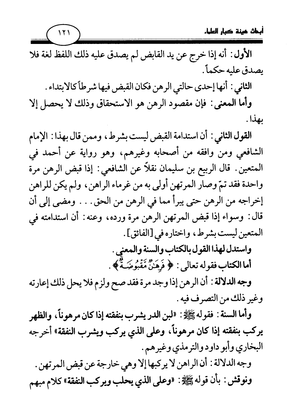 القول الثاني: أن استدامة القبض ليست بشرط، وممن قال بهذا: الإمام الشافعي ومن وافقه من أصحابه وغيرهم، وهو رواية عن أحمد في المتعين. قال الربيع بن سليمان نقلا عن الشافعي: إذا قبض الرهن مرة واحدة فقد تم وصار المرتهن أولى به من غرماء الراهن، ولم يكن للراهن إخراجه من الرهن حتى يبرأ مما في الرهن من الحق. . . ومضى إلى أن قال: وسواء إذا قبض المرتهن الرهن مرة ورده، وعنه: أن استدامته في المتعين ليست بشرط، واختاره في [الفائق] .