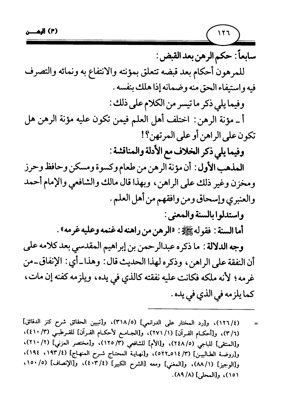 للمرهون أحكام بعد قبضه تتعلق بمؤنته والانتفاع به ونمائه والتصرف فيه واستيفاء الحق منه وضمانه إذا هلك بنفسه.