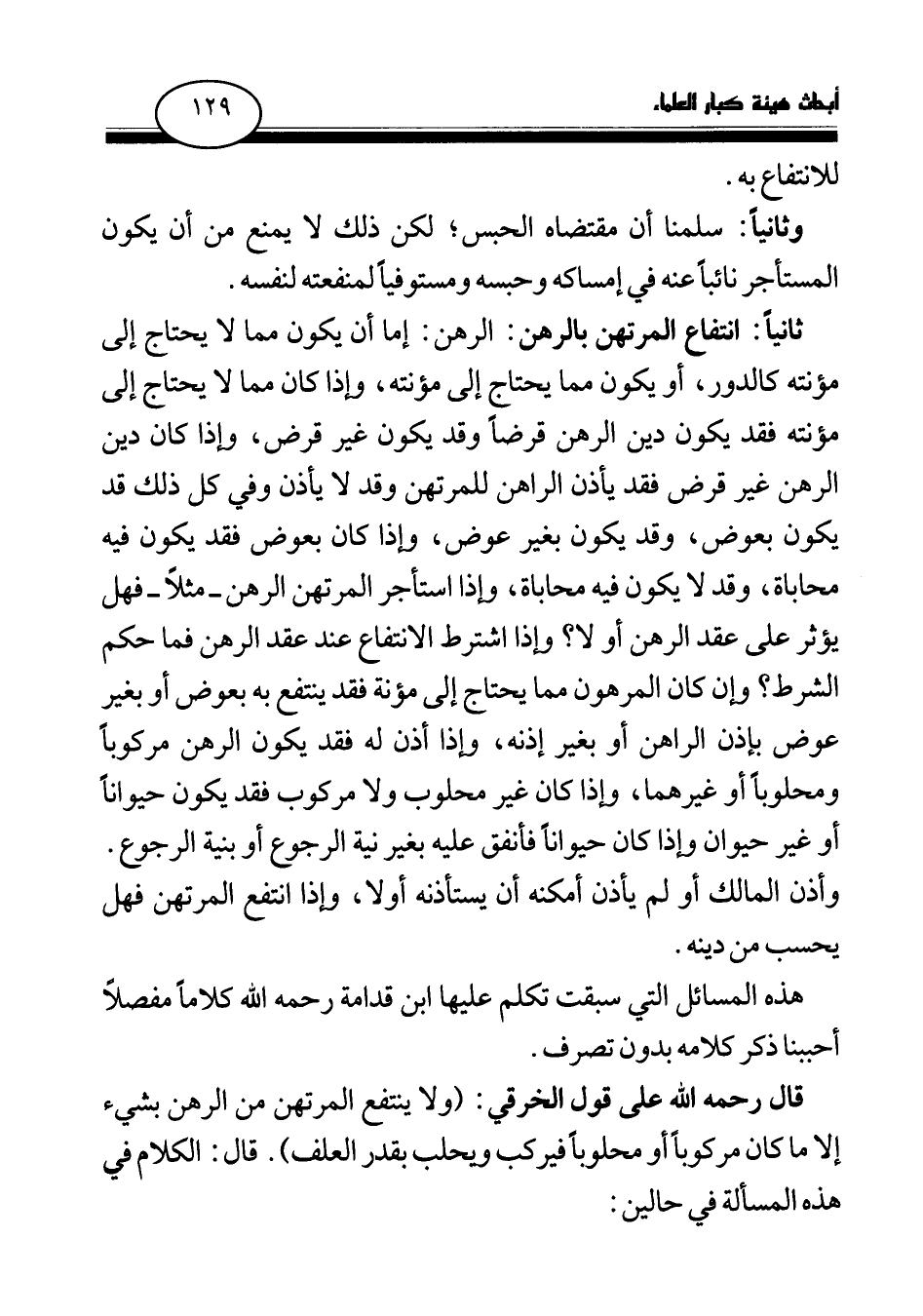 قال - رحمه الله - على قول الخرقي: (ولا ينتفع المرتهن من الرهن بشيء إلا ما كان مركوبا أو محلوبا فيركب ويحلب بقدر العلف) . قال: الكلام في هذه المسألة في حالين: