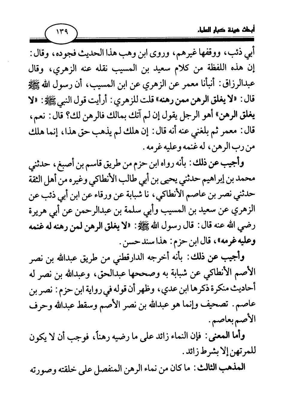 وأجيب عن ذلك: بأنه رواه ابن حزم من طريق قاسم بن أصبغ، حدثني محمد بن إبراهيم حدثني يحيى بن أبي طالب الأنطاكي وغيره من أهل الثقة حدثني نصر بن عاصم الأنطاكي، نا شبابة عن ورقاء عن ابن أبي ذئب عن الزهري عن سعيد بن المسيب وأبي سلمة بن عبد الرحمن عن أبي هريرة رضي الله عنه قال: قال رسول الله صلى الله عليه وسلم: «لا يغلق الرهن لمن رهنه له غنمه وعليه غرمه (¬3) » ، قال ابن حزم: هذا سند حسن.