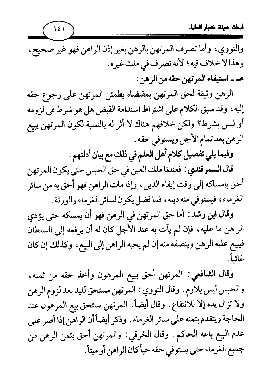وقال ابن رشد: أما حق المرتهن في الرهن فهو أن يمسكه حتى يؤدي الراهن ما عليه، فإن لم يأت به عند الأجل كان له أن يرفعه إلى السلطان فيبيع عليه الرهن وينصفه منه إن لم يجبه الراهن إلى البيع، وكذلك إن كان غائبا.