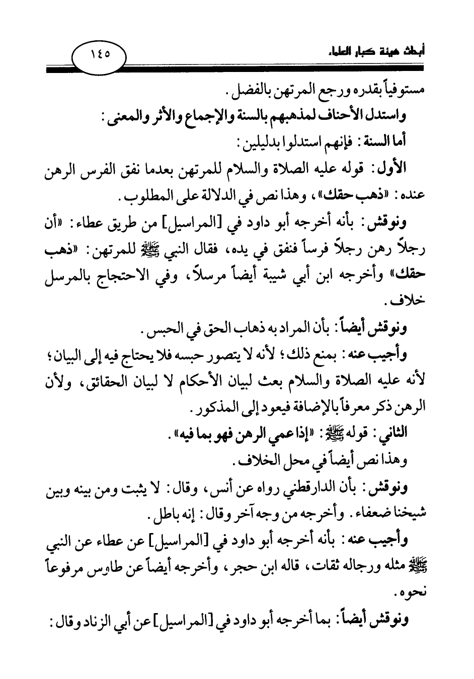 ونوقش: بأنه أخرجه أبو داود في [المراسيل] من طريق عطاء: «أن رجلا رهن رجلا فرسا فنفق في يده، فقال النبي صلى الله عليه وسلم للمرتهن: " ذهب حقك» وأخرجه ابن أبي شيبة أيضا مرسلا، وفي الاحتجاج بالمرسل خلاف.