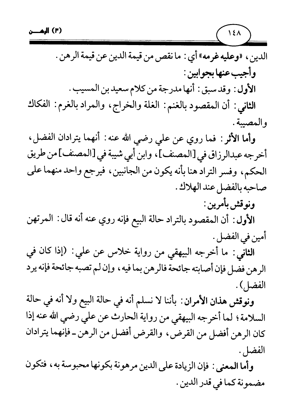 ونوقش هذان الأمران: بأننا لا نسلم أنه في حالة البيع ولا أنه في حالة السلامة؛ لما أخرجه البيهقي من رواية الحارث عن علي رضي الله عنه إذا كان الرهن أفضل من القرض، والقرض أفضل من الرهن - فإنهما يترادان الفضل.