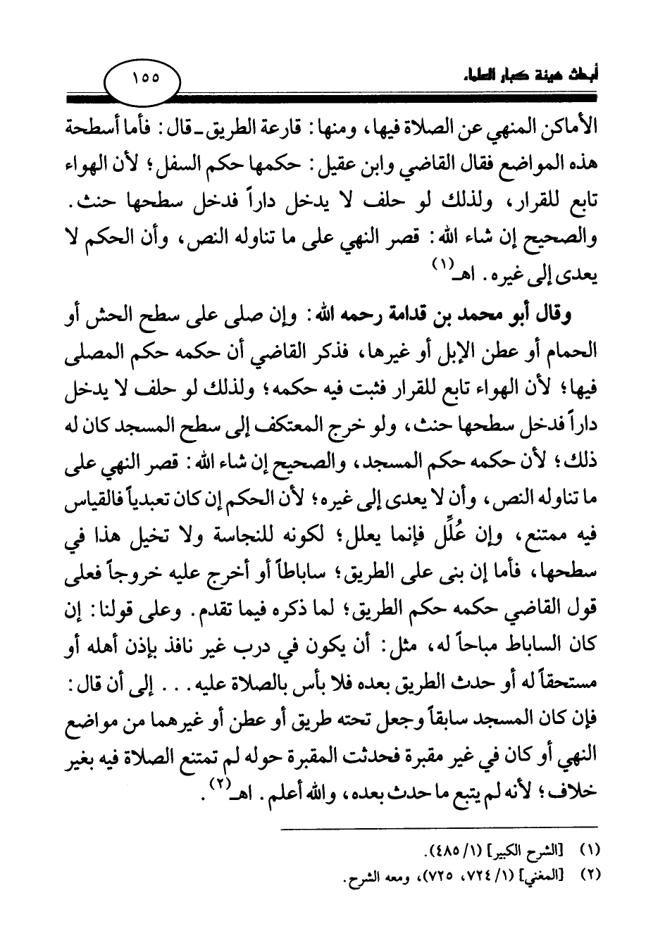 وقال أبو محمد بن قدامة رحمه الله: وإن صلى على سطح الحش أو الحمام أو عطن الإبل أو غيرها، فذكر القاضي أن حكمه حكم المصلى فيها؛ لأن الهواء تابع للقرار فثبت فيه حكمه؛ ولذلك لو حلف لا يدخل دارا فدخل سطحها حنث، ولو خرج المعتكف إلى سطح المسجد كان له ذلك؛ لأن حكمه حكم المسجد، والصحيح إن شاء الله: قصر النهي على ما تناوله النص، وأن لا يعدى إلى غيره؛ لأن الحكم إن كان تعبديا فالقياس فيه ممتنع، وإن علل فإنما يعلل؛ لكونه للنجاسة ولا تخيل هذا في سطحها، فأما إن بنى على الطريق ساباطا أو أخرج عليه خروجا فعلى قول القاضي حكمه حكم الطريق لما ذكره فيما تقدم. وعلى قولنا: إن كان الساباط مباحا له، مثل: أن يكون في درب غير نافذ بإذن أهله أو مستحقا له أو حدث الطريق بعده فلا بأس بالصلاة عليه ... إلى أن قال: فإن كان المسجد سابقا وجعل تحته طريق أو عطن أو غيرهما من مواضع النهي أو كان في غير مقبرة فحدثت المقبرة حوله لم تمتنع الصلاة فيه بغير خلاف؛ لأنه لم يتبع ما حدث بعده، والله أعلم. اهـ (¬2) .