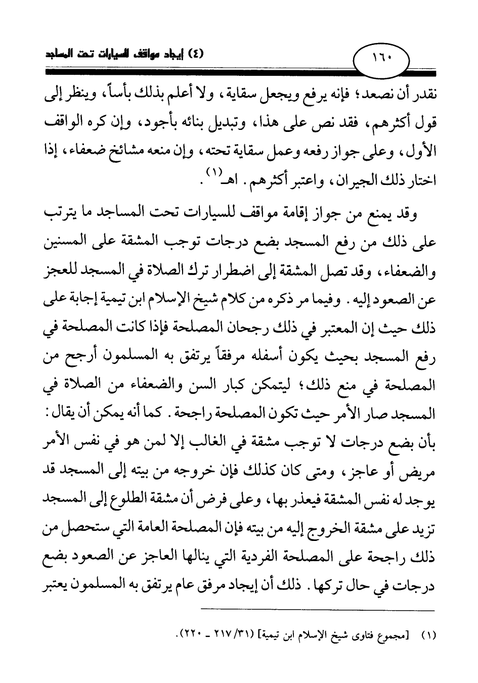 وقد يمنع من جواز إقامة مواقف للسيارات تحت المساجد ما يترتب على ذلك من رفع المسجد بضع درجات توجب المشقة على المسنين والضعفاء، وقد تصل المشقة إلى اضطرار ترك الصلاة في المسجد للعجز عن الصعود إليه. وفيما مر ذكره من كلام شيخ الإسلام ابن تيمية إجابة على ذلك حيث إن المعتبر في ذلك رجحان المصلحة فإذا كانت المصلحة في رفع المسجد بحيث يكون أسفله مرفقا يرتفق به المسلمون أرجح من المصلحة في منع ذلك؛ ليتمكن كبار السن والضعفاء من الصلاة في المسجد صار الأمر حيث تكون المصلحة راجحة. كما أنه يمكن أن يقال: بأن بضع درجات لا توجب مشقة في الغالب إلا لمن هو في نفس الأمر مريض أو عاجز، ومتى كان كذلك فإن خروجه من بيته إلى المسجد قد يوجد له نفس المشقة فيعذر بها، وعلى فرض أن مشقة الطلوع إلى المسجد تزيد على مشقة الخروج إليه من بيته فإن المصلحة العامة التي ستحصل من ذلك راجحة على المصلحة الفردية التي ينالها العاجز عن الصعود بضع درجات في حال تركها. ذلك أن إيجاد مرفق عام يرتفق به المسلمون يعتبر