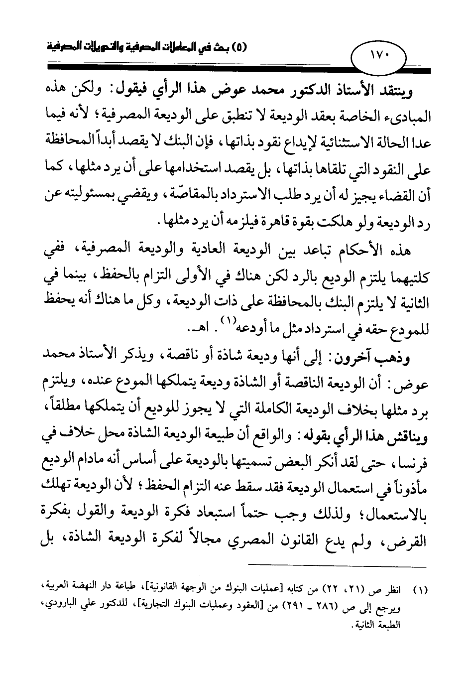 وينتقد الأستاذ الدكتور محمد عوض هذا الرأي فيقول: ولكن هذه المبادئ الخاصة بعقد الوديعة لا تنطبق على الوديعة المصرفية؛ لأنه فيما عدا الحالة الاستثنائية لإيداع نقود بذاتها، فإن البنك لا يقصد أبدا المحافظة على النقود التي تلقاها بذاتها، بل يقصد استخدامها على أن يرد مثلها، كما أن القضاء يجيز له أن يرد طلب الاسترداد بالمقاصة، ويقضي بمسئوليته عن رد الوديعة ولو هلكت بقوة قاهرة فيلزمه أن يرد مثلها.