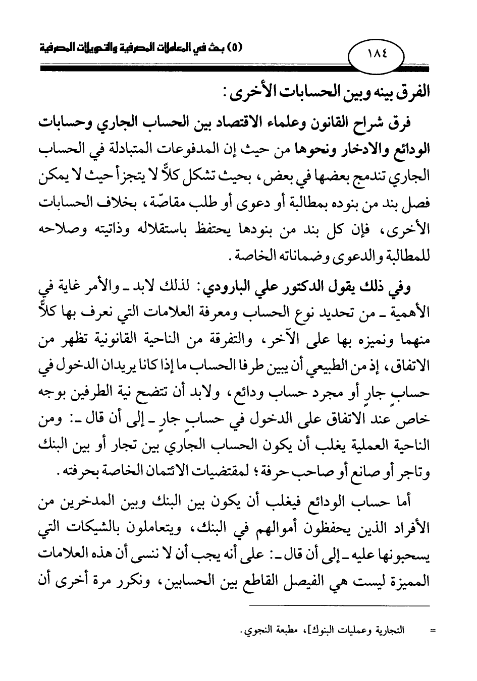 أما حساب الودائع فيغلب أن يكون بين البنك وبين المدخرين من الأفراد الذين يحفظون أموالهم في البنك، ويتعاملون بالشيكات التي يسحبونها عليه - إلى أن قال-: على أنه يجب أن لا ننسى أن هذه العلامات المميزة ليست هي الفيصل القاطع بين الحسابين، ونكرر مرة أخرى أن