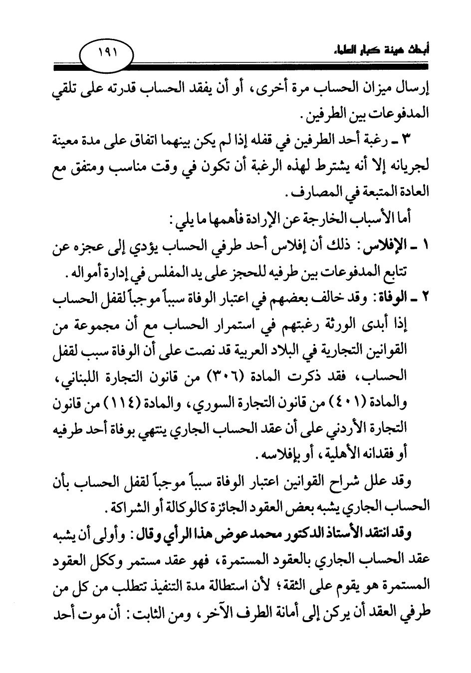 2 - الوفاة: وقد خالف بعضهم في اعتبار الوفاة سببا موجبا لقفل الحساب إذا أبدى الورثة رغبتهم في استمرار الحساب مع أن مجموعة من القوانين التجارية في البلاد العربية قد نصت على أن الوفاة سبب لقفل الحساب، فقد ذكرت المادة (306) من قانون التجارة اللبناني، والمادة (401) من قانون التجارة السوري، والمادة (114) من قانون التجارة الأردني على أن عقد الحساب الجاري ينتهي بوفاة أحد طرفيه أو فقدانه الأهلية، أو بإفلاسه.