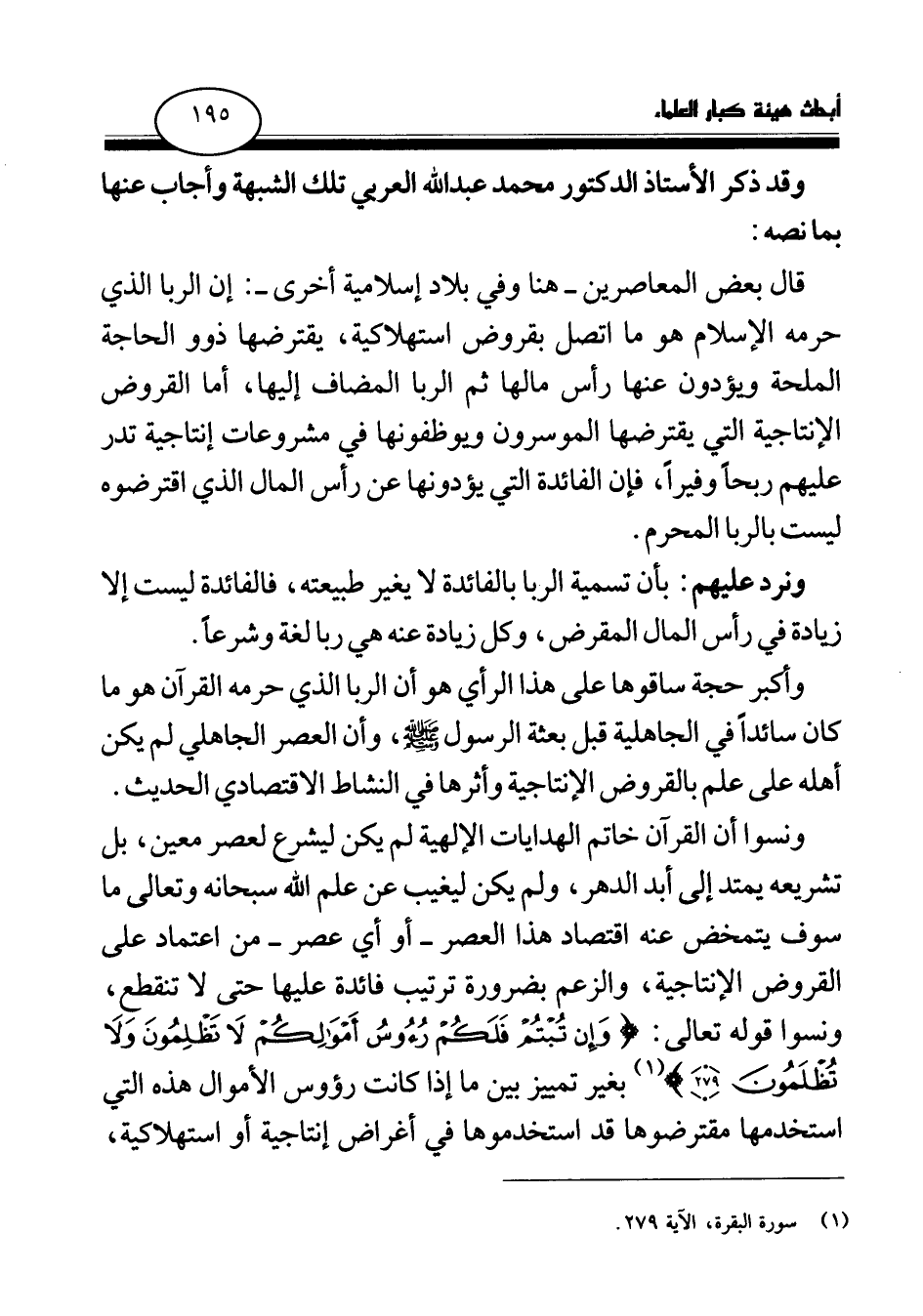 وأكبر حجة ساقوها على هذا الرأي هو أن الربا الذي حرمه القرآن هو ما كان سائدا في الجاهلية قبل بعثة الرسول صلى الله عليه وسلم، وأن العصر الجاهلي لم يكن أهله على علم بالقروض الإنتاجية وأثرها في النشاط الاقتصادي الحديث. ونسوا أن القرآن خاتم الهدايات الإلهية لم يكن ليشرع لعصر معين، بل تشريعه يمتد إلى أبد الدهر، ولم يكن ليغيب عن علم الله سبحانه وتعالى ما سوف يتمخض عنه اقتصاد هذا العصر- أو أي عصر- من اعتماد على القروض الإنتاجية، والزعم بضرورة ترتيب فائدة عليها حتى لا تنقطع، ونسوا قوله تعالى: {وَإِنْ تُبْتُمْ فَلَكُمْ رُءُوسُ أَمْوَالِكُمْ لَا تَظْلِمُونَ وَلَا تُظْلَمُونَ} (¬1) بغير تمييز بين ما إذا كانت رءوس الأموال هذه التي استخدمها مقترضوها قد استخدموها في أغراض إنتاجية أو استهلاكية،