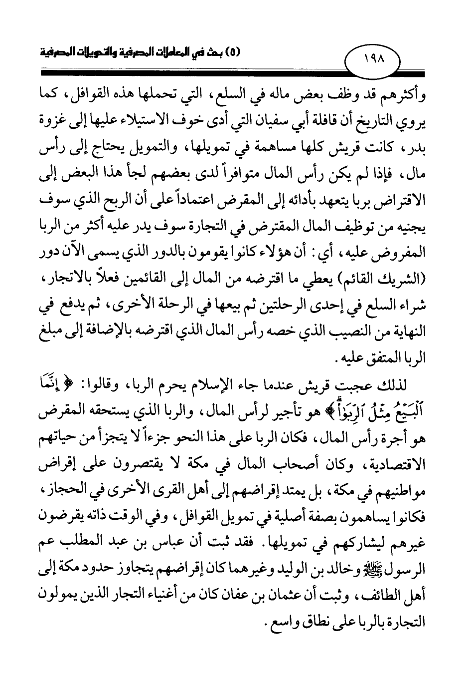 وأكثر قد وظف بعض ماله في السلع، التي تحملها هذه القوافل، كما يروي التاريخ أن قافلة أبي سفيان التي أدى خوف الاستيلاء عليها إلى غزوة بدر، كانت قريش كلها مساهمة في تمويلها، والتمويل يحتاج إلى رأس مال، فإذا لم يكن رأس المال متوافرا لدى بعضهم لجأ هذا البعض إلى الاقتراض بربا يتعهد بأدائه إلى المقرض اعتمادا على أن الربح الذي سوف يجنيه من توظيف المال المقترض في التجارة سوف يدر عليه أكثر من الربا المفروض عليه، أي: أن هؤلاء كانوا يقومون بالدور الذي يسمى الآن دور (الشريك القائم) يعطي ما اقترضه من المال إلى القائمين فعلا بالاتجار، شراء السلع في إحدى الرحلتين ثم بيعها في الرحلة الأخرى، ثم يدفع في النهاية من النصيب الذي خصه رأس المال الذي اقترضه بالإضافة إلى مبلغ الربا المتفق عليه.