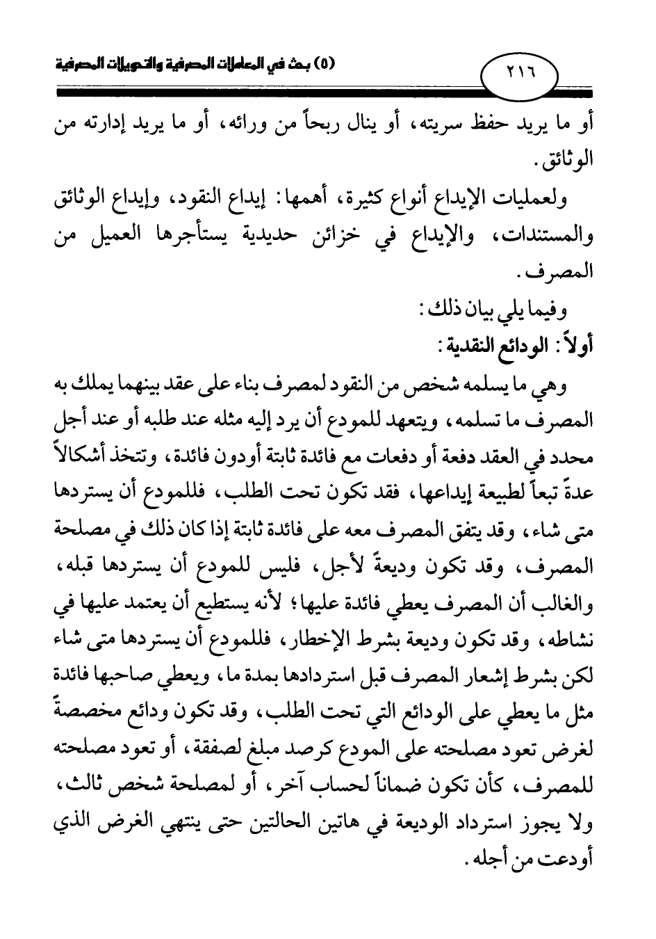 وهي ما يسلمه شخص من النقود لمصرف بناء على عقد بينهما يملك به المصرف ما تسلمه، ويتعهد للمودع أن يرد إليه مثله عند طلبه أو عند أجل محدد في العقد دفعة أو دفعات مع فائدة ثابتة أو دون فائدة، وتتخذ أشكالا عدة تبعا لطبيعة إيداعها، فقد تكون تحت الطلب، فللمودع أن يستردها متى شاء، وقد يتفق المصرف معه على فائدة ثابتة إذا كان ذلك في مصلحة المصرف، وقد تكون وديعة لأجل، فليس للمودع أن يستردها قبله، والغالب أن المصرف يعطي فائدة عليها، لأنه يستطيع أن يعتمد عليها في نشاطه، وقد تكون وديعة بشرط الإخطار، فللمودع أن يستردها متى شاء لكن بشرط إشعار المصرف قبل استردادها بمدة ما، ويعطي صاحبها فائدة مثل ما يعطي على الودائع التي تحت الطلب، وقد تكون ودائع مخصصة لغرض تعود مصلحته على المودع كرصد مبلغ لصفقة، أو تعود مصلحته للمصرف، كأن تكون ضمانا لحساب آخر، أو لمصلحة شخص ثالث، ولا يجوز استرداد الوديعة في هاتين الحالتين حتى ينتهي الغرض الذي أودعت من أجله.