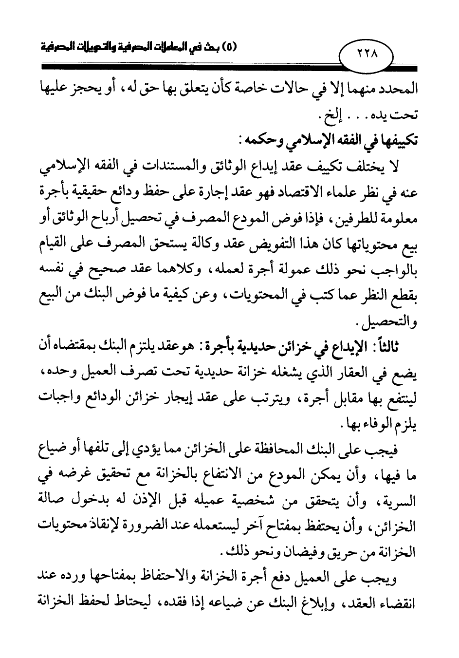لا يختلف تكييف عقد إيداع الوثائق والمستندات في الفقه الإسلامي عنه في نظر علماء الاقتصاد فهو عقد إجارة على حفظ ودائع حقيقية بأجرة معلومة للطرفين، فإذا فوض المودع المصرف في تحصيل أرباح الوثائق أو بيع محتوياتها كان هذا التفويض عقد وكالة يستحق المصرف على القيام بالواجب نحو ذلك عمولة أجرة لعمله، وكلاهما عقد صحيح في نفسه بقطع النظر عما كتب في المحتويات، وعن كيفية ما فوض البنك من البيع والتحصيل.