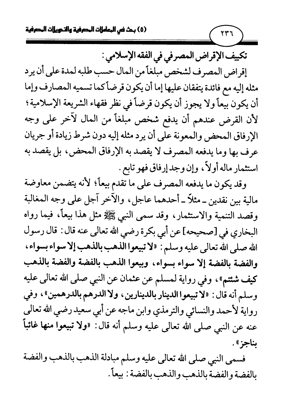 وقد يكون ما يدفعه المصرف على ما تقدم بيعا؛ لأنه يتضمن معاوضة مالية بين نقدين - مثلا - أحدهما عاجل، والآخر آجل على وجه المغالبة وقصد التنمية والاستثمار، وقد سمى النبي صلى الله عليه وسلم مثل هذا بيعا، فيما رواه البخاري في [صحيحه] عن أبي بكرة رضي الله تعالى عنه قال: قال رسول الله صلى الله تعالى عليه وسلم: «لا تبيعوا الذهب بالذهب إلا سواء بسواء، والفضة بالفضة إلا سواء بسواء، وبيعوا الذهب بالفضة والفضة بالذهب كيف شئتم (¬1) » ، وفي رواية لمسلم عن عثمان عن النبي صلى الله تعالى عليه وسلم أنه قال: «لا تبيعوا الدينار بالدينارين، ولا الدرهم بالدرهمين (¬2) » ، وفي رواية لأحمد والنسائي والترمذي وابن ماجه عن أبي سعيد رضي الله تعالى عنه عن النبي صلى الله تعالى عليه وسلم أنه قال: «ولا تبيعوا منها غائبا بناجز (¬3) » .