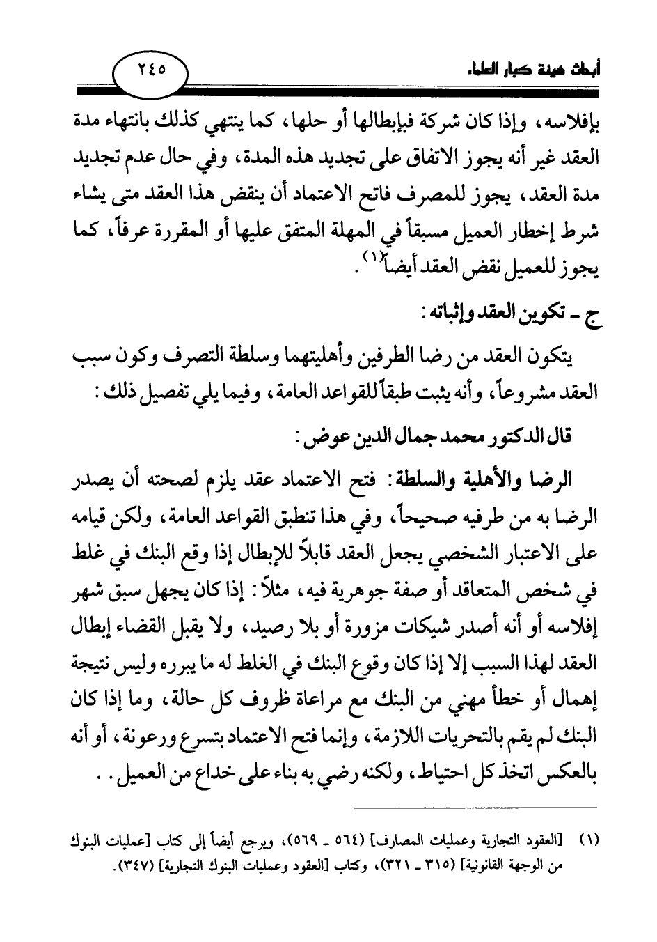 الرضا والأهلية والسلطة: فتح الاعتماد عقد يلزم لصحته أن يصدر الرضا به من طرفيه صحيحا، وفي هذا تنطبق القواعد العامة، ولكن قيامه على الاعتبار الشخصي يجعل العقد قابلا للإبطال إذا وقع البنك في غلط في شخص المتعاقد أو صفة جوهرية فيه، مثلا: إذا كان يجهل سبق شهر إفلاسه أو أنه أصدر شيكات مزورة أو بلا رصيد، ولا يقبل القضاء إبطال العقد لهذا السبب إلا إذا كان وقوع البنك في الغلط له ما يبرره وليس نتيجة إهمال أو خطأ مهني من البنك مع مراعاة ظروف كل حالة، وما إذا كان البنك لم يقم بالتحريات اللازمة، وإنما فتح الاعتماد بتسرع ورعونة، أو أنه بالعكس اتخذ كل احتياط، ولكنه رضي به بناء على خداع من العميل. .