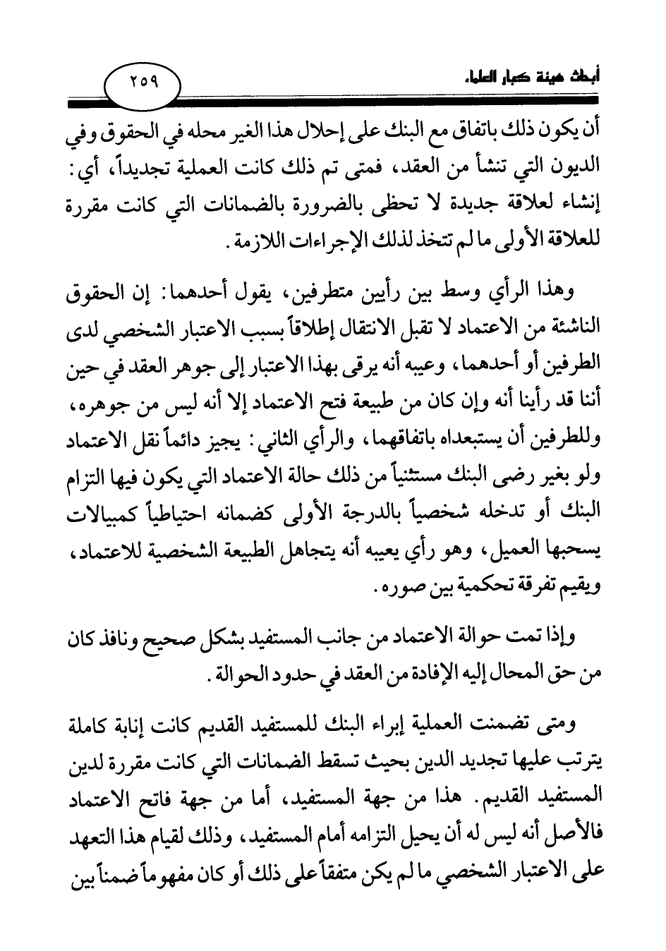 وهذا الرأي وسط بين رأيين متطرفين، يقول أحدهما: إن الحقوق الناشئة من الاعتماد لا تقبل الانتقال إطلاقا بسبب الاعتبار الشخصي لدى الطرفين أو أحدهما، وعيبه أنه يرقى بهذا الاعتبار إلى جوهر العقد في حين أننا قد رأينا أنه وإن كان من طبيعة فتح الاعتماد إلا أنه ليس من جوهره، وللطرفين أن يستبعداه باتفاقهما، والرأي الثاني: يجيز دائما نقل الاعتماد ولو بغير رضا البنك مستثنيا من ذلك حالة الاعتماد التي يكون فيها التزام البنك أو تدخله شخصيا بالدرجة الأولى كضمانه احتياطيا كمبيالات يسحبها العميل، وهو رأي يعيبه أنه يتجاهل الطبيعة الشخصية للاعتماد، ويقيم تفرقة تحكمية بين صوره.