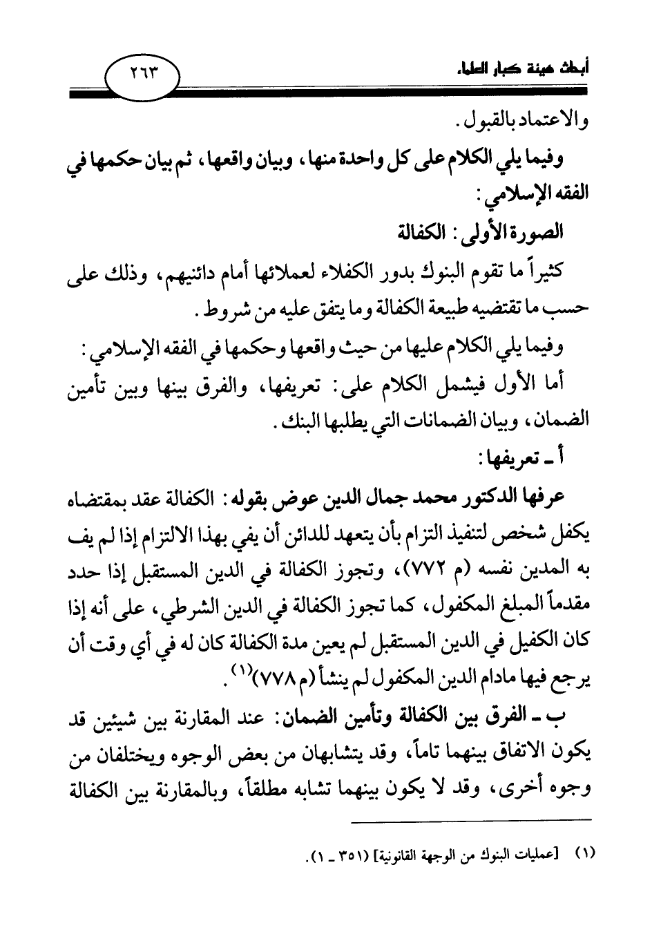 عرفها الدكتور محمد جمال الدين عوض بقوله: الكفالة عقد بمقتضاه يكفل شخص لتنفيذ التزام بأن يتعهد للدائن أن يفي بهذا الالتزام إذا لم يف به المدين نفسه (م 772) ، وتجوز الكفالة في الدين المستقبل إذا حدد مقدما المبلغ المكفول، كما تجوز الكفالة في الدين الشرطي، على أنه إذا كان الكفيل في الدين المستقبل لم يعين مدة الكفالة كان له في أي وقت أن يرجع فيها ما دام الدين المكفول لم ينشأ (م 778) . (¬1) .