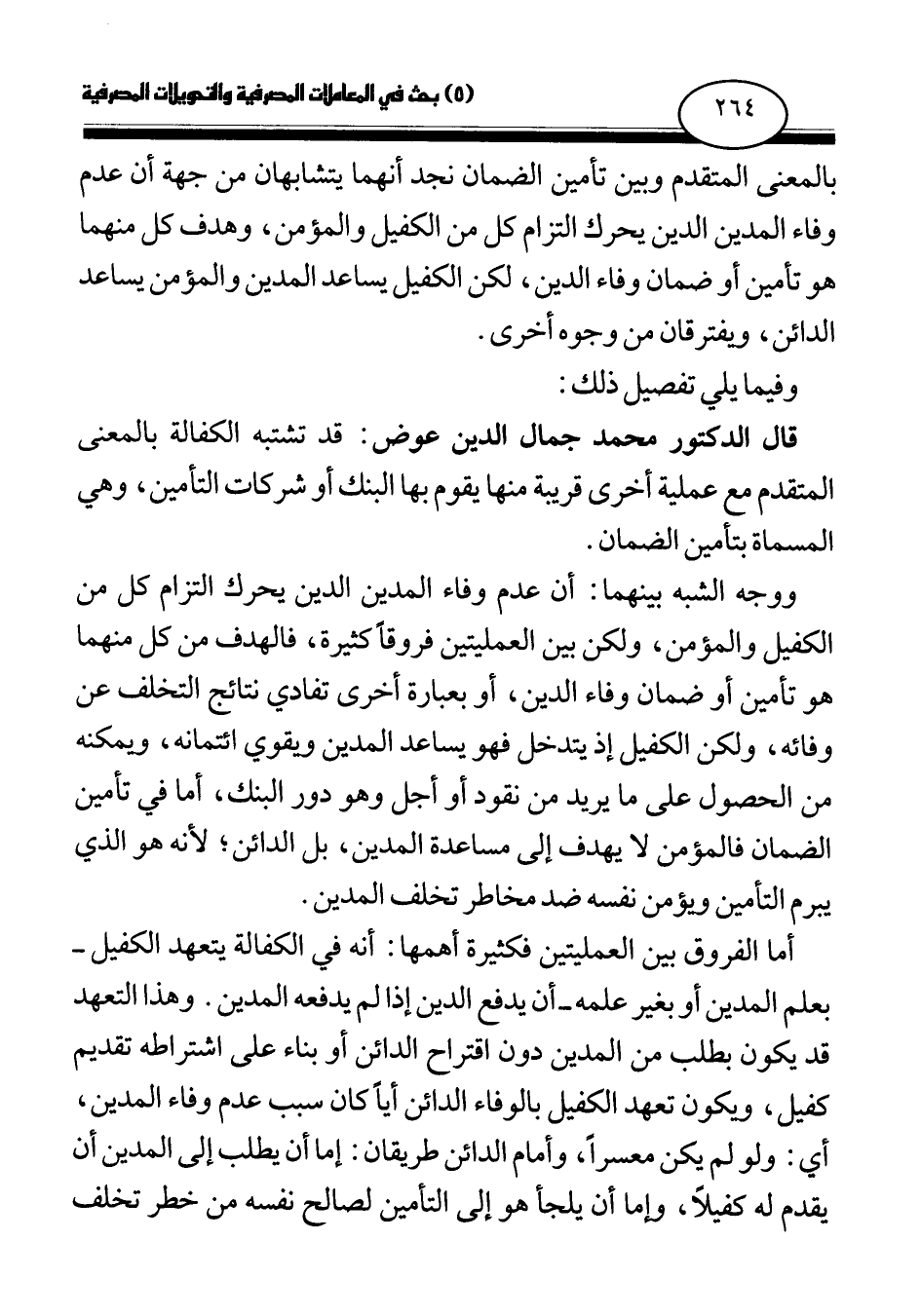 قال الدكتور محمد جمال الدين عوض: قد تشتبه الكفالة بالمعنى المتقدم مع عملية أخرى قريبة منها يقوم بها البنك أو شركات التأمين، وهي المسماة بتأمين الضمان.