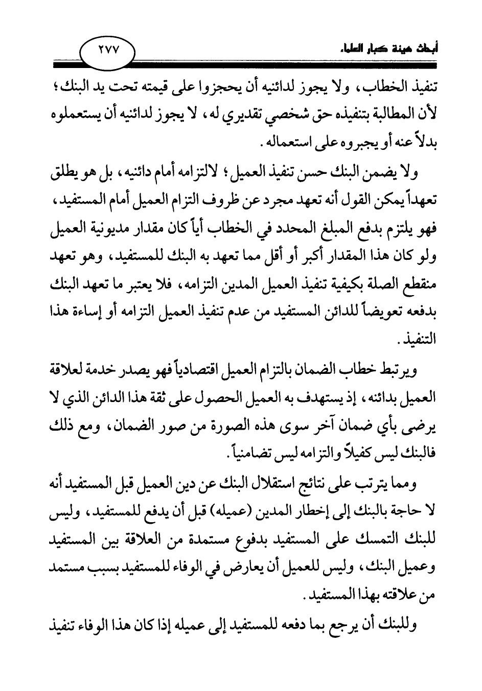 ولا يضمن البنك حسن تنفيذ العميل؛ لالتزامه أمام دائنيه، بل هو يطلق تعهدا يمكن القول أنه تعهد مجرد عن ظروف التزام العميل أمام المستفيد، فهو يلتزم بدفع المبلغ المحدد في الخطاب أيا كان مقدار مديونية العميل ولو كان هذا المقدار أكبر أو أقل مما تعهد به البنك للمستفيد، وهو تعهد منقطع الصلة بكيفية تنفيذ العميل المدين التزامه، فلا يعتبر ما تعهد البنك بدفعه تعويضا للدائن المستفيد من عدم تنفيذ العميل التزامه أو إساءة هذا التنفيذ.