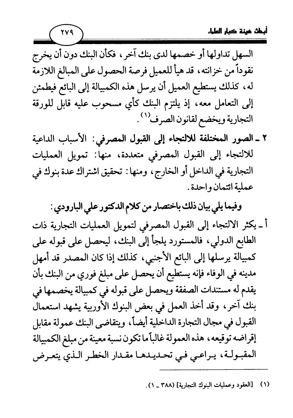 السهل تداولها أو خصمها لدى بنك آخر، فكأن البنك دون أن يخرج نقودا من خزانته، قد هيأ للعميل فرصة الحصول على المبالغ اللازمة له، كذلك يستطيع العميل أن يرسل هذه الكمبيالة إلى البائع فيطمئن إلى التعامل معه، إذ يلتزم البنك كأي مسحوب عليه قابل للورقة التجارية ويخضع لقانون الصرف (¬1) .