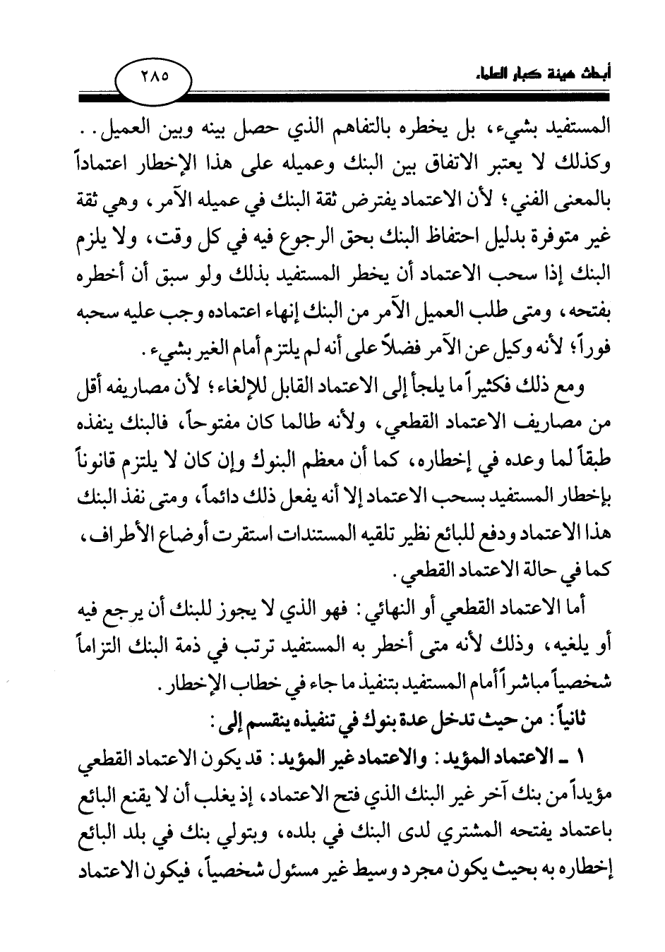 المستفيد بشيء، بل يخطره بالتفاهم الذي حصل بينه وبين العميل.. وكذلك لا يعتبر الاتفاق بين البنك وعميله على هذا الإخطار اعتمادا بالمعنى الفني؛ لأن الاعتماد يفترض ثقة البنك في عميله الآمر، وهي ثقة غير متوفرة بدليل احتفاظ البنك بحق الرجوع فيه في كل وقت، ولا يلزم البنك إذا سحب الاعتماد أن يخطر المستفيد بذلك ولو سبق أن أخطره بفتحه، ومتى طلب العميل الآمر من البنك إنهاء اعتماده وجب عليه سحبه فورا؛ لأنه وكيل عن الآمر فضلا على أنه لم يلتزم أمام الغير بشيء.