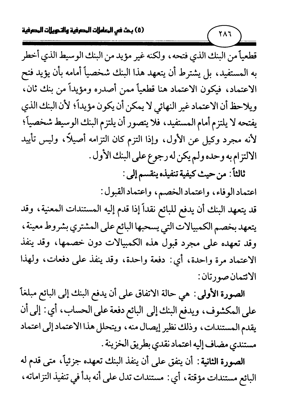 قد يتعهد البنك أن يدفع للبائع نقدا إذا قدم إليه المستندات المعنية، وقد يتعهد بخصم الكمبيالات التي يسحبها البائع على المشتري بشروط معينة، وقد تعهده على مجرد قبول هذه الكمبيالات دون خصمها، وقد ينفذ الاعتماد مرة واحدة، أي: دفعة واحدة، وقد ينفذ على دفعات، ولهذا الائتمان صورتان: