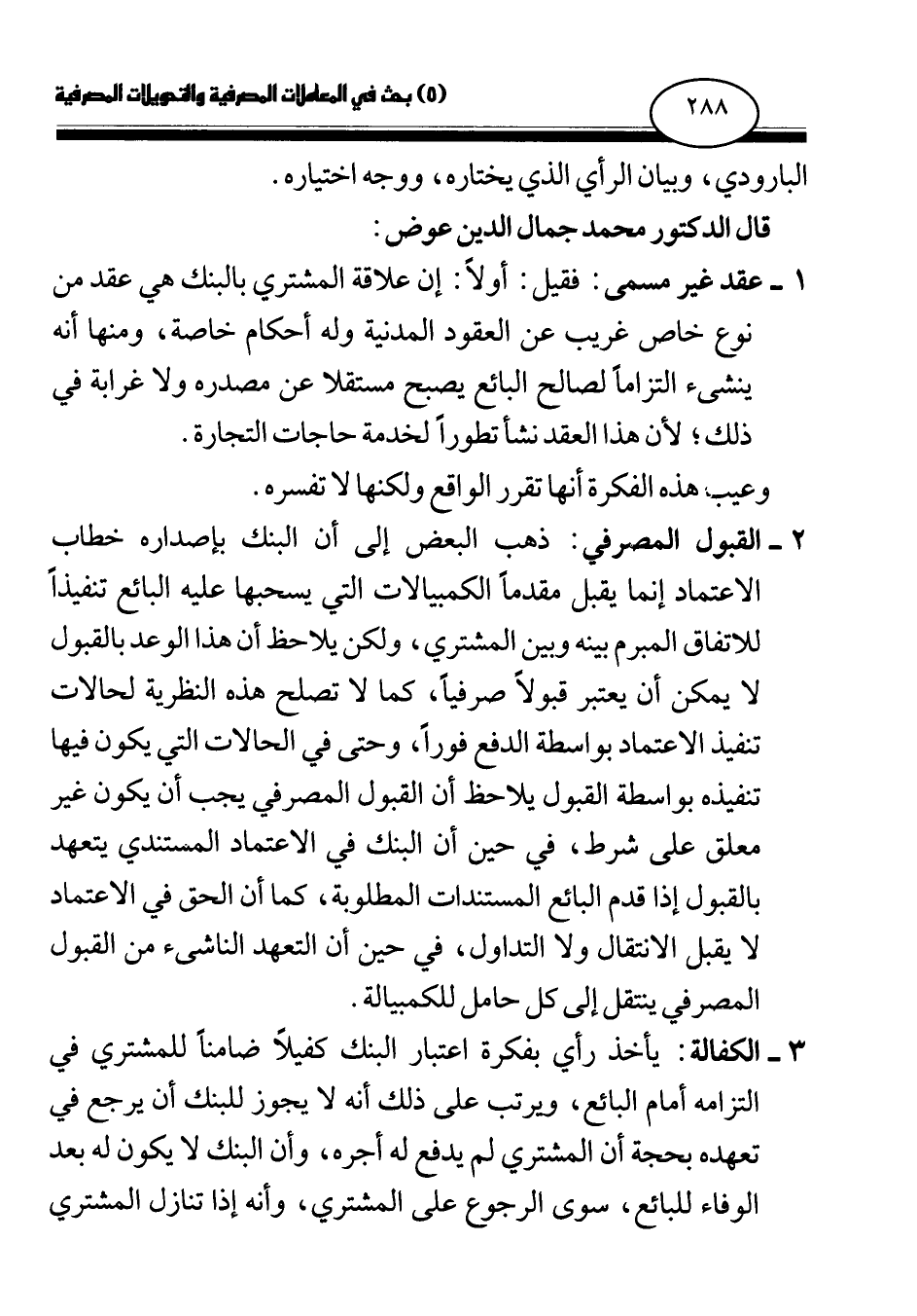 1 - عقد غير مسمى: فقيل: أولا: إن علاقة المشتري بالبنك هي عقد من نوع خاص غريب عن العقود المدنية وله أحكام خاصة، ومنها أنه ينشئ التزاما لصالح البائع يصبح مستقلا عن مصدره ولا غرابة في ذلك؛ لأن هذا العقد نشأ تطورا لخدمة حاجات التجارة.