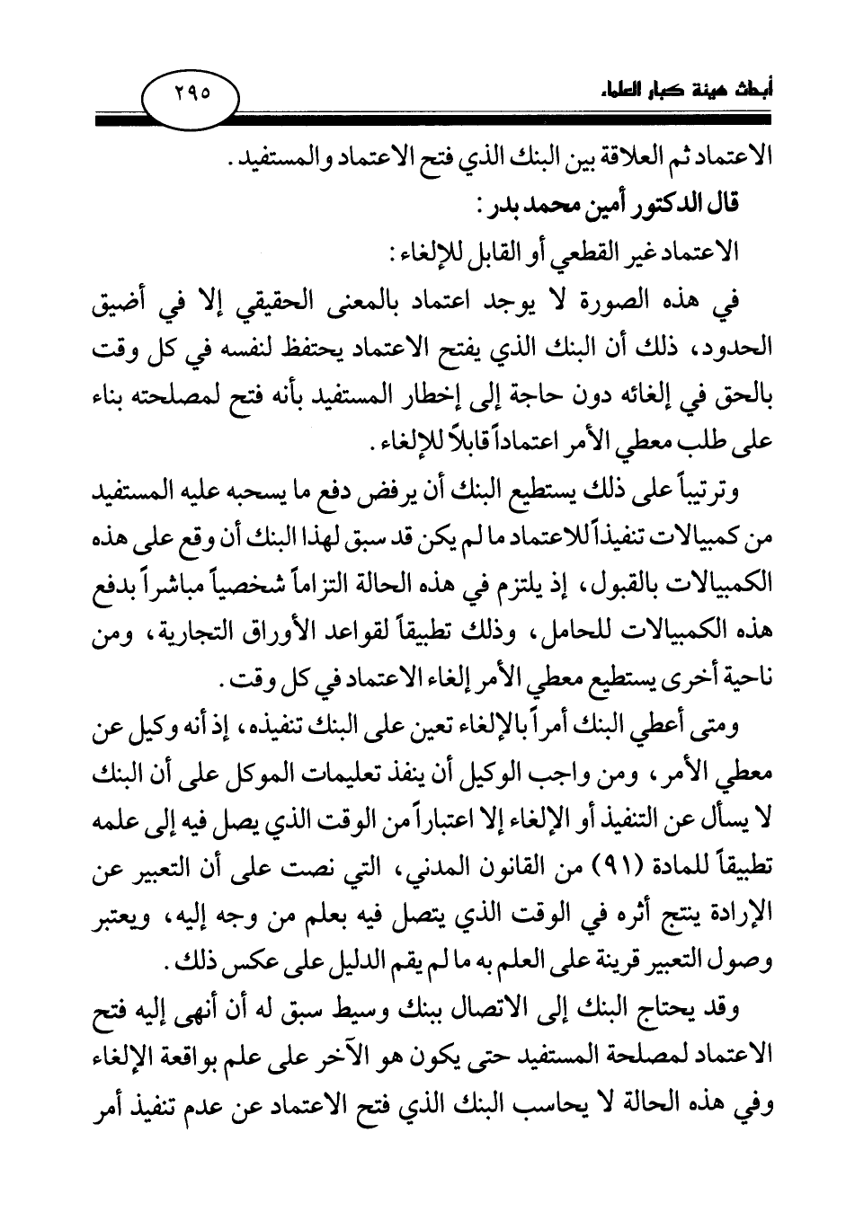 ومتى أعطي البنك أمرا بالإلغاء تعين على البنك تنفيذه، إذ أنه وكيل عن معطي الأمر، ومن واجب الوكيل أن ينفذ تعليمات الموكل على أن البنك لا يسأل عن التنفيذ أو الإلغاء إلا اعتبارا من الوقت الذي يصل فيه إلى علمه تطبيقا للمادة (91) من القانون المدني، التي نصت على أن التعبير عن الإرادة ينتج أثره في الوقت الذي يتصل فيه بعلم من وجه إليه، ويعتبر وصول التعبير قرينة على العلم به ما لم يقم الدليل على عكس ذلك.