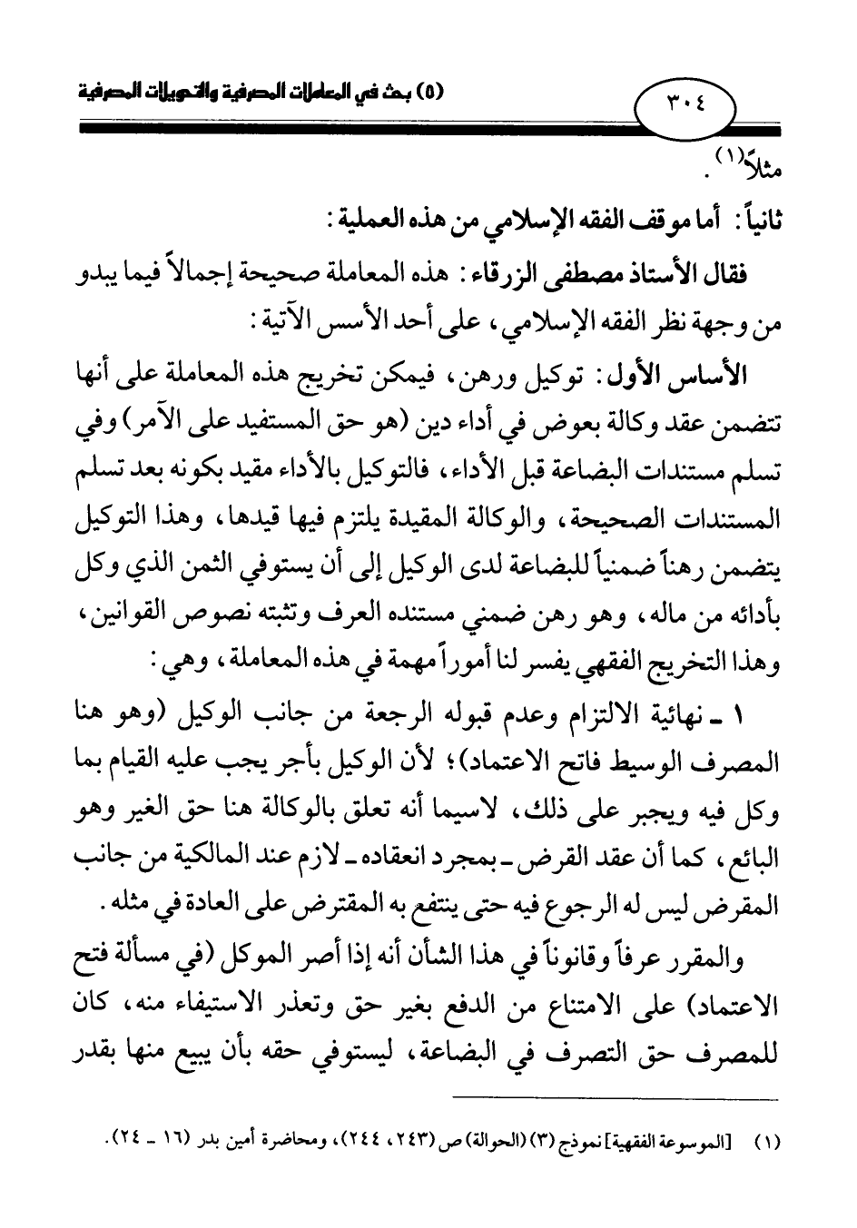 فقال الأستاذ مصطفى الزرقاء: هذه المعاملة صحيحة إجمالا فيما يبدو من وجهة نظر الفقه الإسلامي، على أحد الأسس الآتية: