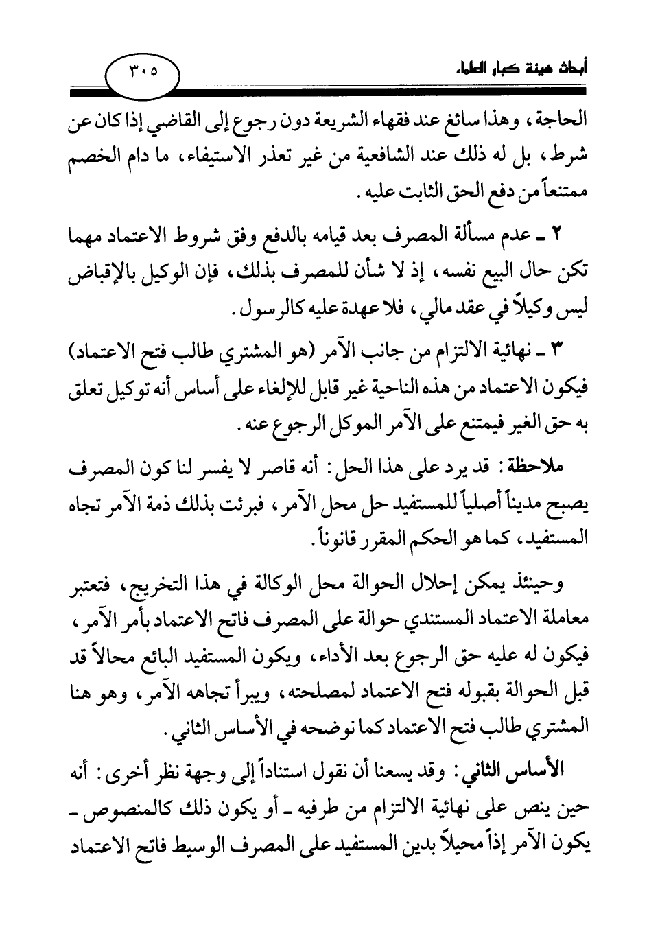 2 - عدم مسألة المصرف بعد قيامه بالدفع وفق شروط الاعتماد مهما تكن حال البيع نفسه، إذ لا شأن للمصرف بذلك، فإن الوكيل بالإقباض ليس وكيلا في عقد مالي، فلا عهدة عليه كالرسول.
