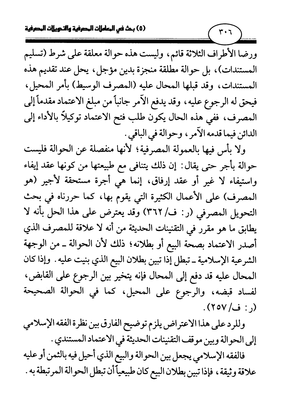 ولا بأس فيها بالعمولة المصرفية؛ لأنها منفصلة عن الحوالة فليست حوالة بأجر حتى يقال: إن ذلك يتنافى مع طبيعتها من كونها عقد إيفاء واستيفاء لا غير أو عقد إرفاق، إنما هي أجرة مستحقة لأجير (هو المصرف) على الأعمال الكثيرة التي يقوم بها، كما حررناه في بحث التحويل المصرفي (ر: ف \ 362) وقد يعترض على هذا الحل بأنه لا يطابق ما هو مقرر في التقنيات الحديثة من أنه لا علاقة للمصرف الذي أصدر الاعتماد بصحة البيع أو بطلانه؛ ذلك لأن الحوالة -من الوجهة الشرعية الإسلامية- تبطل إذا تبين بطلان البيع الذي بنيت عليه. وإذا كان المحال عليه قد دفع إلى المحال فإنه يتخير بين الرجوع على القابض، لفساد قبضه، والرجوع على المحيل، كما في الحوالة الصحيحة (ر: ف \ 257) .