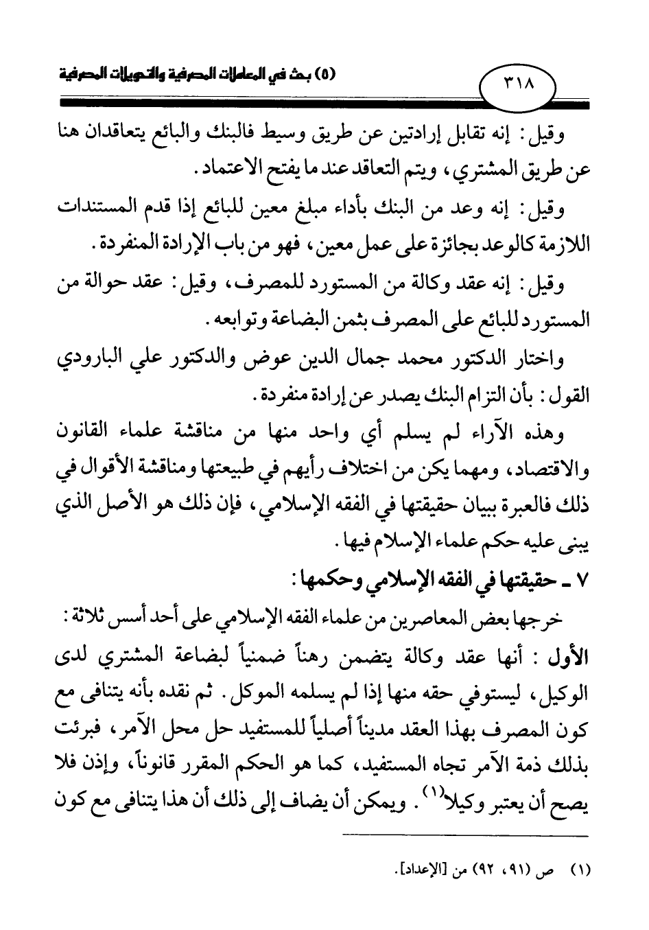 الأول: أنها عقد وكالة يتضمن رهنا ضمنيا لبضاعة المشتري لدى الوكيل، ليستوفي حقه منها إذا لم يسلمه الموكل. ثم نقده بأنه يتنافى مع كون المصرف بهذا العقد مدينا أصليا للمستفيد حل محل الآمر، فبرئت بذلك ذمة الآمر تجاه المستفيد، كما هو الحكم المقرر قانونا، وإذن فلا يصح أن يعتبر وكيلا (¬1)