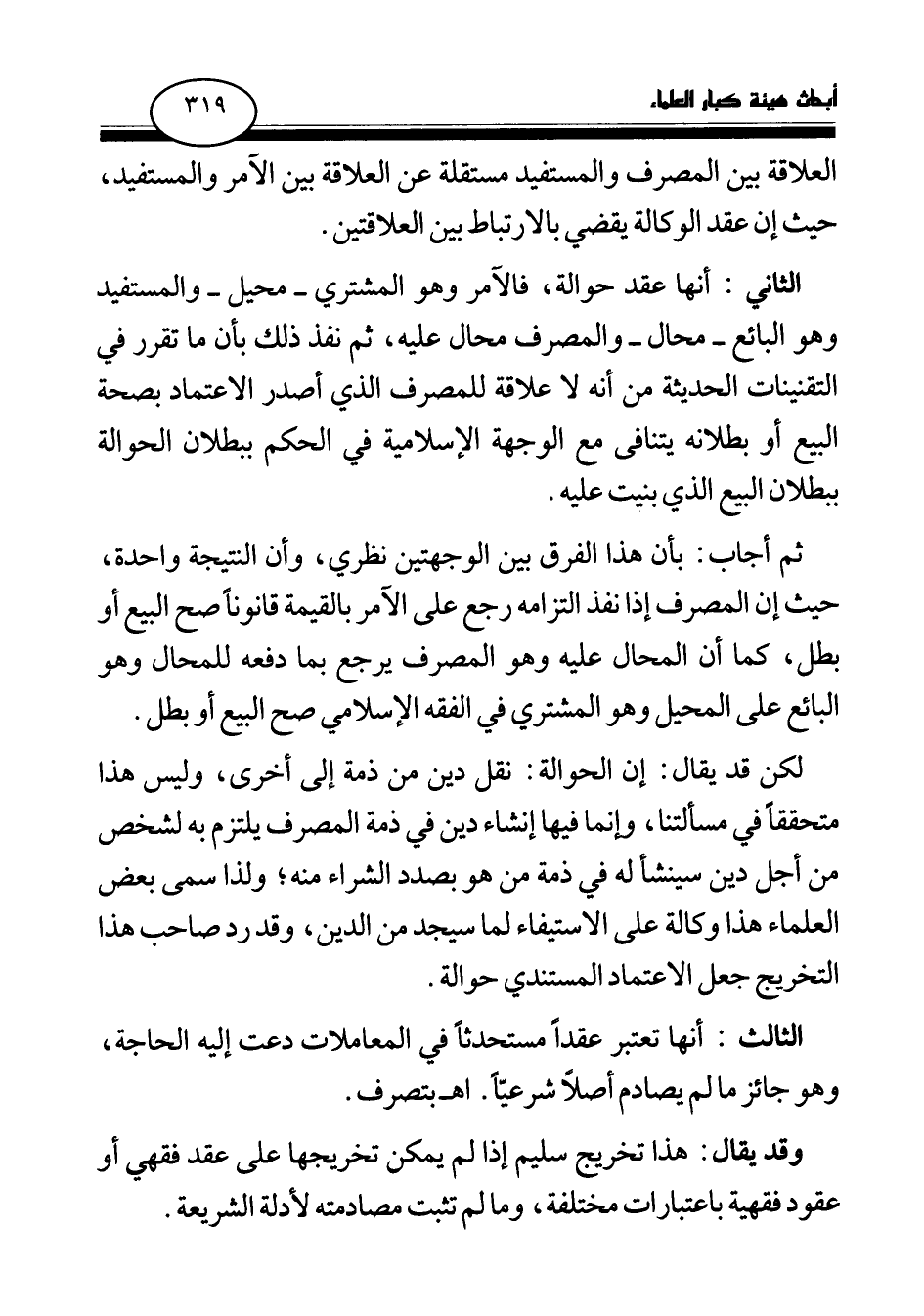 الثاني: أنها عقد حوالة، فالآمر وهو المشتري - محيل - والمستفيد وهو البائع - محال - والمصرف محال عليه، ثم نفذ ذلك بأن ما تقرر في التقنيات الحديثة من أنه لا علاقة للمصرف الذي أصدر الاعتماد بصحة البيع أو بطلانه يتنافى مع الوجهة الإسلامية في الحكم ببطلان الحوالة ببطلان البيع الذي بنيت عليه.