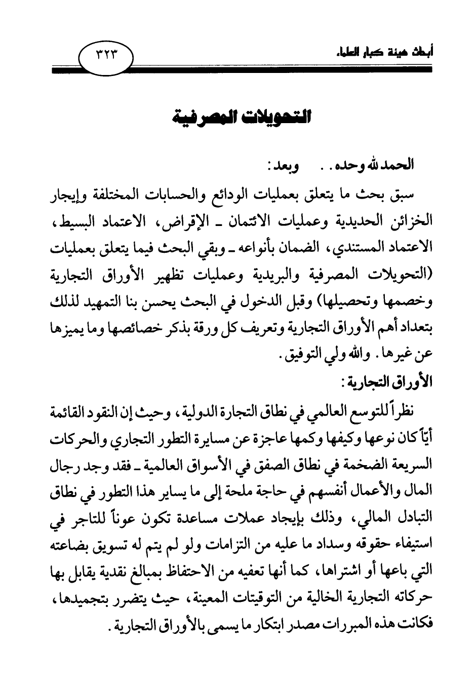 سبق بحث ما يتعلق بعمليات الودائع والحسابات المختلفة وإيجار الخزائن الحديدية وعمليات الائتمان - الإقراض، الاعتماد البسيط، الاعتماد المستندي، الضمان بأنواعه - وبقي البحث فيما يتعلق بعمليات (التحويلات المصرفية والبريدية وعمليات تظهير الأوراق التجارية وخصمها وتحصيلها) وقبل الدخول في البحث يحسن بنا التمهيد لذلك بتعداد أهم الأوراق التجارية وتعريف كل ورقة بذكر خصائصها وما يميزها عن غيرها. والله ولي التوفيق.