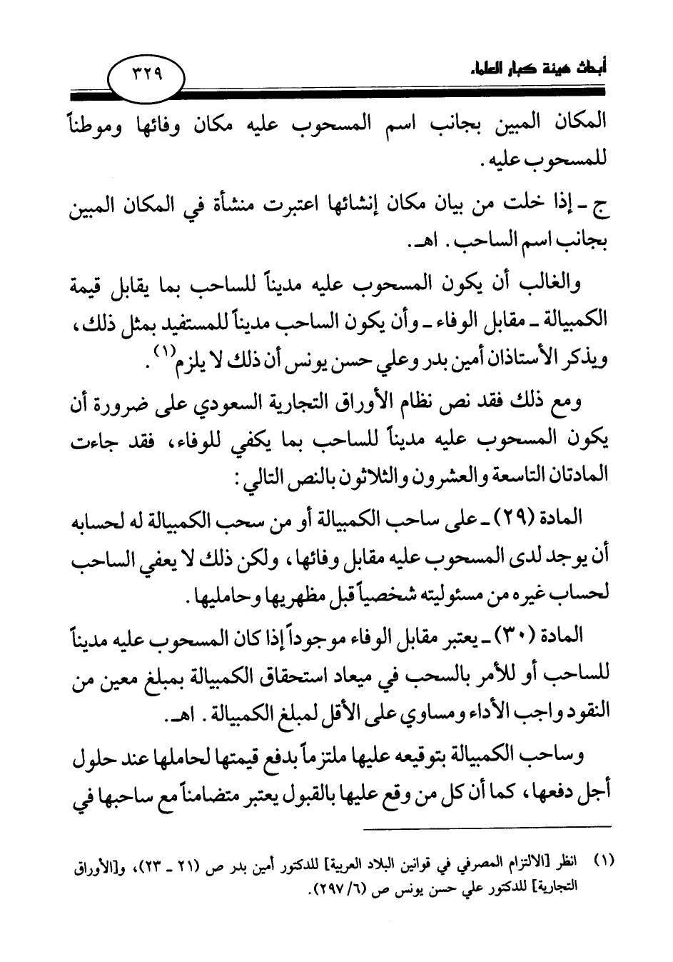 المادة (29) - على ساحب الكمبيالة أو من سحب الكمبيالة له لحسابه أن يوجد لدى المسحوب عليه مقابل وفائها، ولكن ذلك لا يعفي الساحب لحساب غيره من مسئوليته شخصيا قبل مظهريها وحامليها.