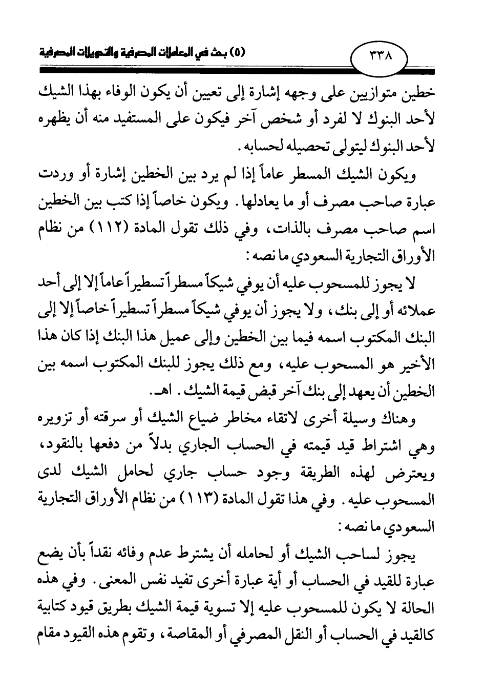 لا يجوز للمسحوب عليه أن يوفي شيكا مسطرا تسطيرا عاما إلا إلى أحد عملائه أو إلى بنك، ولا يجوز أن يوفي شيكا مسطرا تسطيرا خاصا إلا إلى البنك المكتوب اسمه فيما بين الخطين وإلى عميل هذا البنك إذا كان هذا الأخير هو المسحوب عليه، ومع ذلك يجوز للبنك المكتوب اسمه بين الخطين أن يعهد إلى بنك آخر قبض قيمة الشيك. اهـ.