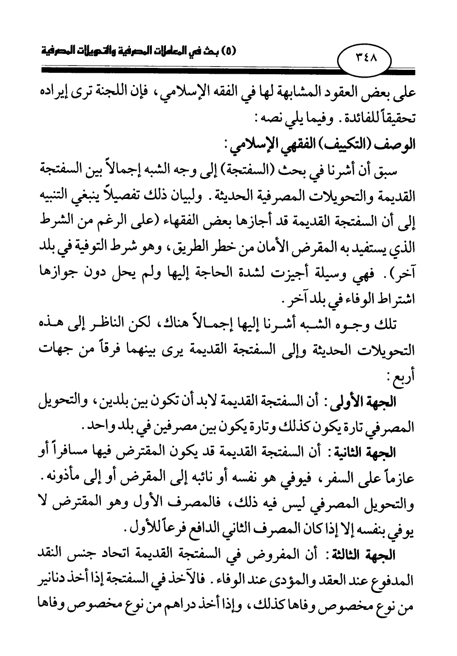الجهة الأولى: أن السفتجة القديمة لا بد أن تكون بين بلدين، والتحويل المصرفي تارة يكون كذلك وتارة يكون بين مصرفين في بلد واحد.
