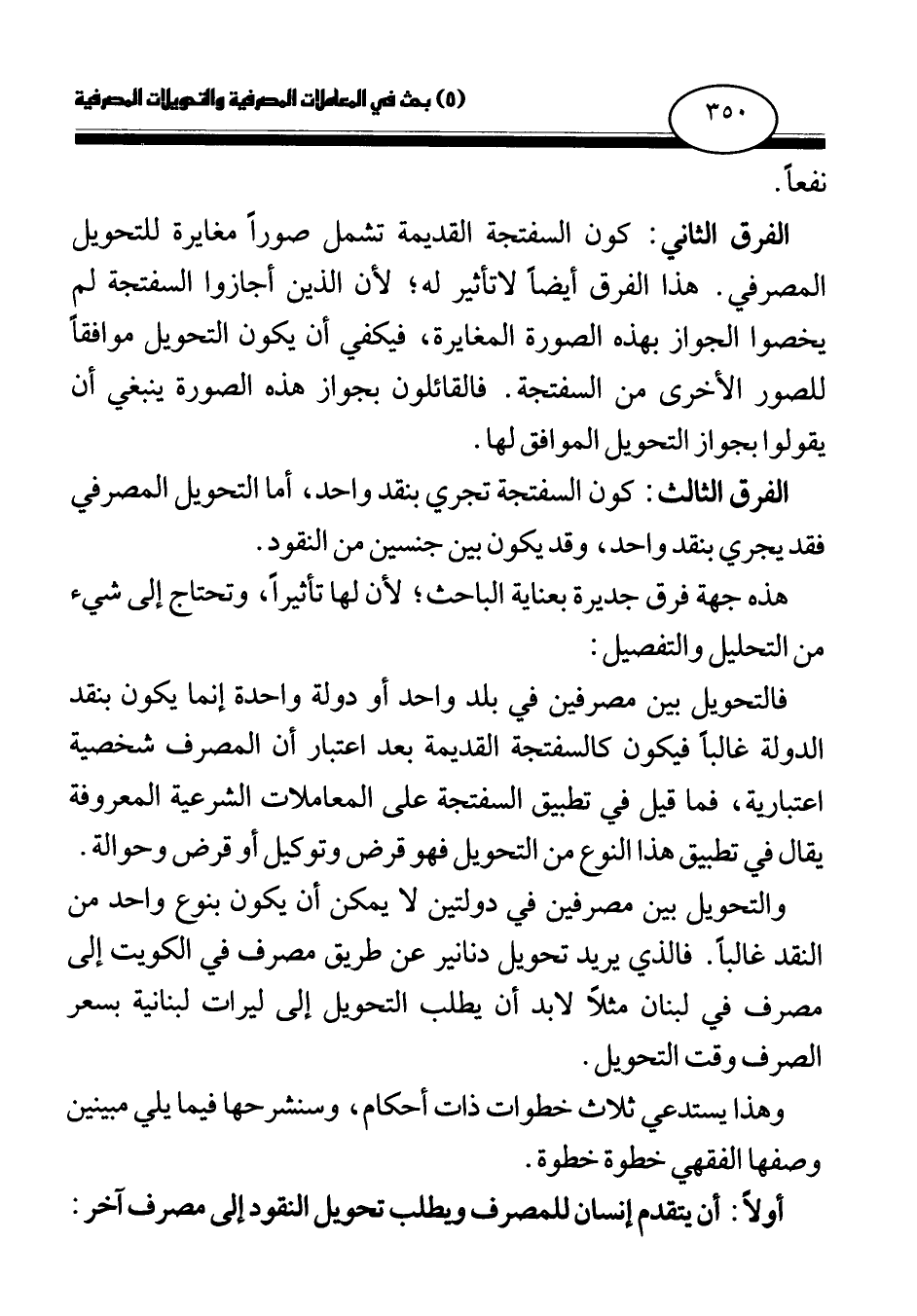 الفرق الثاني: كون السفتجة القديمة تشمل صورا مغايرة للتحويل المصرفي. هذا الفرق أيضا لا تأثير له؛ لأن الذين أجازوا السفتجة لم يخصوا الجواز بهذه الصورة المغايرة، فيكفي أن يكون التحويل موافقا للصور الأخرى من السفتجة. فالقائلون بجواز هذه الصورة ينبغي أن يقولوا بجواز التحويل الموافق لها.