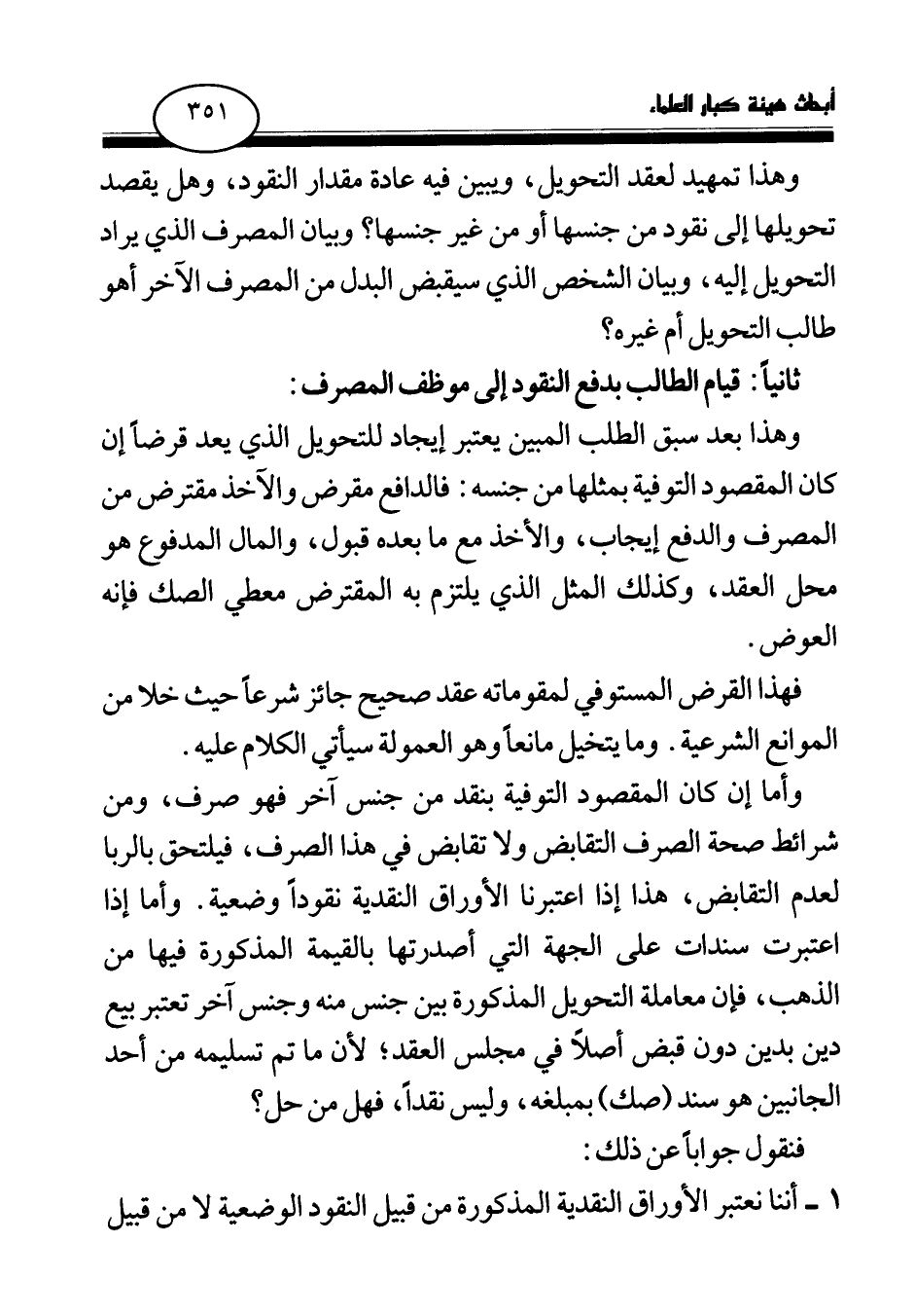 وأما إن كان المقصود التوفية بنقد من جنس آخر فهو صرف، ومن شرائط صحة الصرف التقابض ولا تقابض في هذا الصرف، فيلتحق بالربا لعدم التقابض، هذا إذا اعتبرنا الأوراق النقدية نقودا وضعية. وأما إذا اعتبرت سندات على الجهة التي أصدرتها بالقيمة المذكورة فيها من الذهب، فإن معاملة التحويل المذكورة بين جنس منه وجنس آخر تعتبر بيع دين بدين دون قبض أصلا في مجلس العقد؛ لأن ما تم تسليمه من أحد الجانبين هو سند (صك) بمبلغه، وليس نقدا، فهل من حل؟