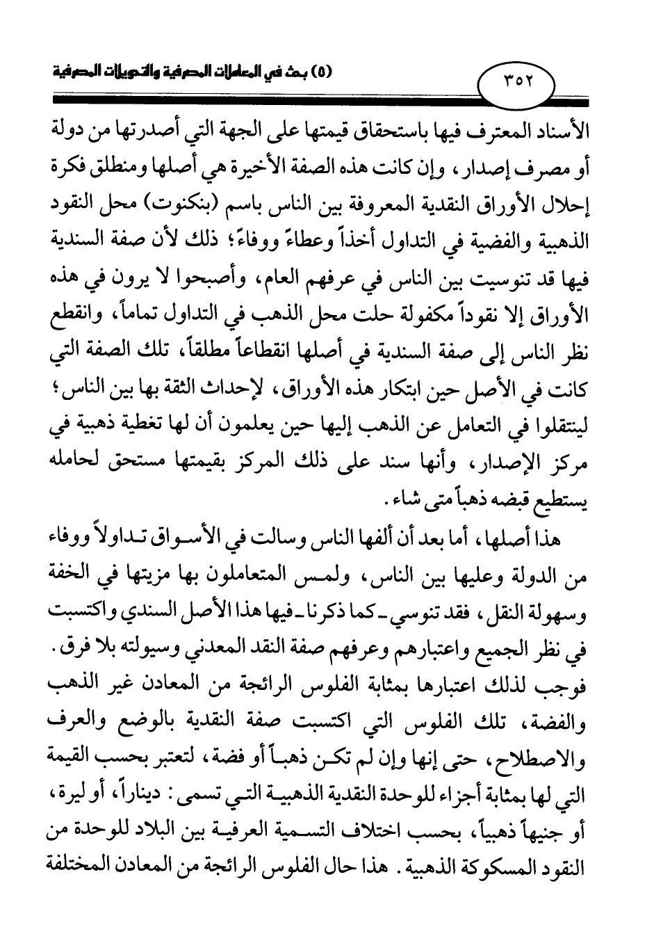 الأسناد المعترف فيها باستحقاق قيمتها على الجهة التي أصدرتها من دولة أو مصرف إصدار، وإن كانت هذه الصفة الأخيرة هي أصلها ومنطلق فكرة إحلال الأوراق النقدية المعروفة بين الناس باسم (بنكنوت) محل النقود الذهبية والفضية في التداول أخذا وعطاء ووفاء؛ ذلك لأن صفة السندية فيها قد تنوسيت بين الناس في عرفهم العام، وأصبحوا لا يرون في هذه الأوراق إلا نقودا مكفولة حلت محل الذهب في التداول تماما، وانقطع نظر الناس إلى صفة السندية في أصلها انقطاعا مطلقا، تلك الصفة التي كانت في الأصل حين ابتكار هذه الأوراق، لإحداث الثقة بها بين الناس؛ لينتقلوا في التعامل عن الذهب إليها حين يعلمون أن لها تغطية ذهبية في مركز الإصدار، وأنها سند على ذلك المركز بقيمتها مستحق لحامله يستطيع قبضه ذهبا متى شاء.