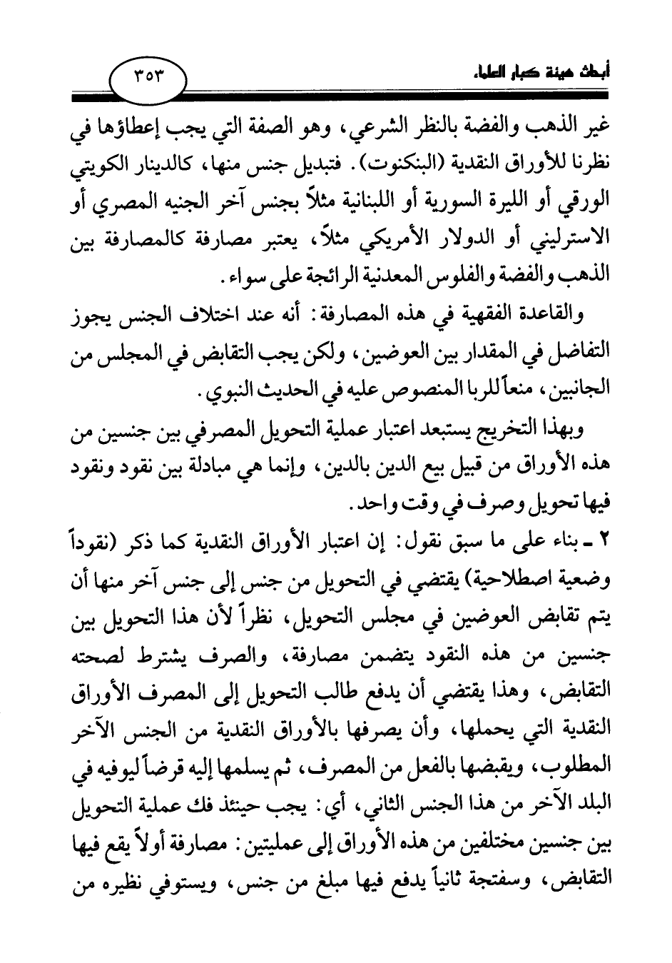 غير الذهب والفضة بالنظر الشرعي، وهو الصفة التي يجب إعطاؤها في نظرنا للأوراق النقدية (البنكنوت) . فتبديل جنس منها، كالدينار الكويتي الورقي أو الليرة السورية أو اللبنانية مثلا بجنس آخر الجنيه المصري أو الاسترليني أو الدولار الأمريكي مثلا، يعتبر مصارفة كالمصارفة بين الذهب والفضة والفلوس المعدنية الرائجة على سواء.