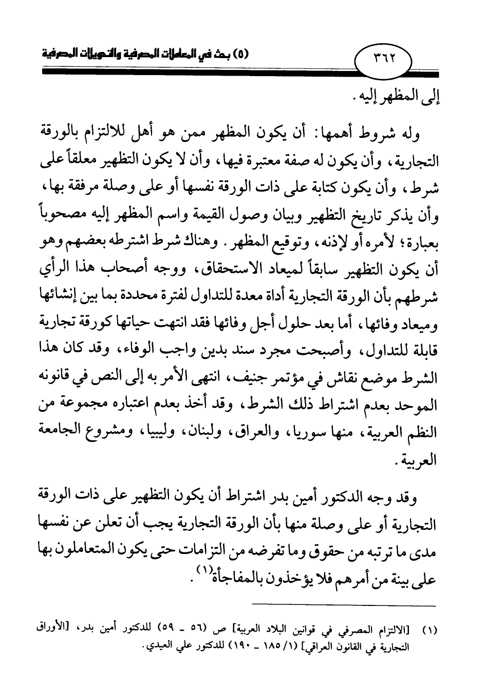 وله شروط أهمها: أن يكون المظهر ممن هو أهل للالتزام بالورقة التجارية، وأن يكون له صفة معتبرة فيها، وأن لا يكون التظهير معلقا على شرط، وأن يكون كتابة على ذات الورقة نفسها أو على وصلة مرفقة بها، وأن يذكر تاريخ التظهير وبيان وصول القيمة واسم المظهر إليه مصحوبا بعبارة؟ لأمره أو لإذنه، وتوقيع المظهر. وهناك شرط اشترطه بعضهم وهو أن يكون التظهير سابقا لميعاد الاستحقاق، ووجه أصحاب هذا الرأي شرطهم بأن الورقة التجارية أداة معدة للتداول لفترة محددة بما بين إنشائها وميعاد وفائها، أما بعد حلول أجل وفائها فقد انتهت حياتها كورقة تجارية قابلة للتداول، وأصبحت مجرد سند بدين واجب الوفاء، وقد كان هذا الشرط موضع نقاش في مؤتمر جنيف، انتهى الأمر به إلى النص في قانونه الموحد بعدم اشتراط ذلك الشرط، وقد أخذ بعدم اعتباره مجموعة من النظم العربية، منها سوريا، والعراق، ولبنان، وليبيا، ومشروع الجامعة العربية.