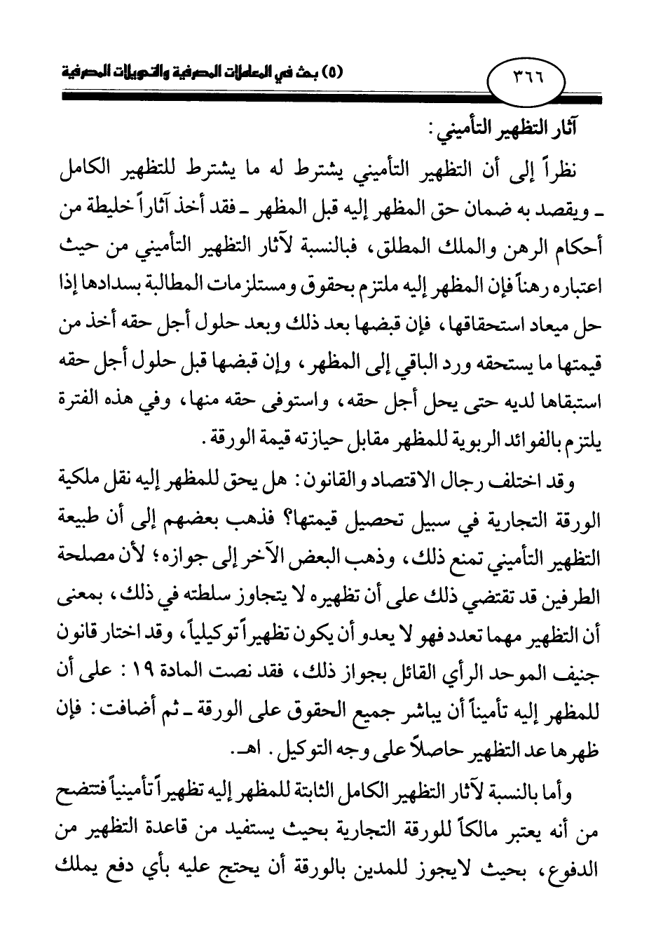 وقد اختلف رجال الاقتصاد والقانون: هل يحق للمظهر إليه نقل ملكية الورقة التجارية في سبيل تحصيل قيمتها؟ فذهب بعضهم إلى أن طبيعة التظهير التأميني تمنع ذلك، وذهب البعض الآخر إلى جوازه؛ لأن مصلحة الطرفين قد تقتضي ذلك على أن تظهيره لا يتجاوز سلطته في ذلك، بمعنى أن التظهير مهما تعدد فهو لا يعدو أن يكون تظهيرا توكيليا، وقد اختار قانون جنيف الموحد الرأي القائل بجواز ذلك، فقد نصت المادة 19: على أن للمظهر إليه تأمينا أن يباشر جميع الحقوق على الورقة- ثم أضافت: فإن ظهرها عد التظهير حاصلا على وجه التوكيل. اهـ.