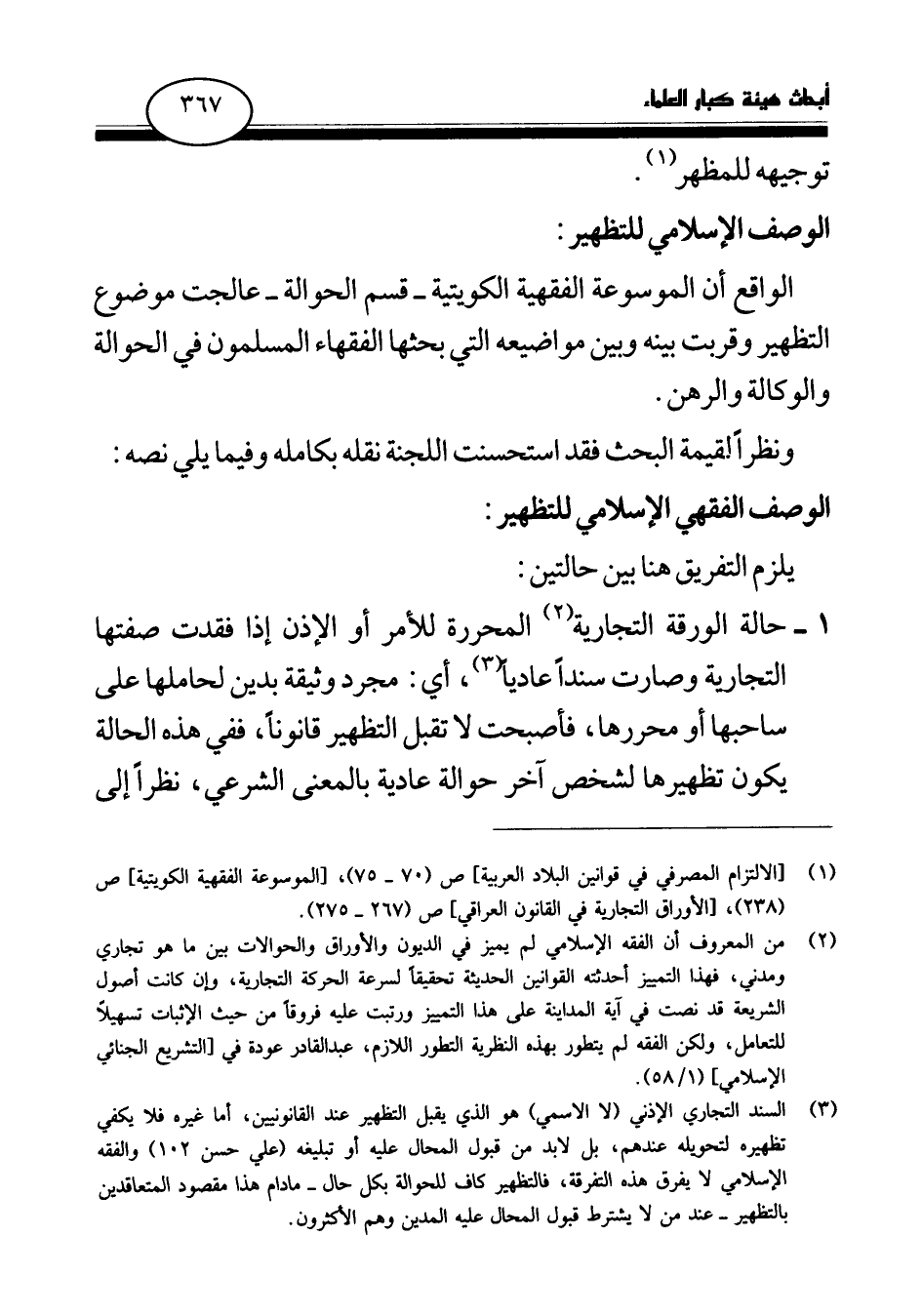 الوصف الإسلامي للتظهير: الواقع أن الموسوعة الفقهية الكويتية- قسم الحوالة- عالجت موضوع التظهير وقربت بينه وبين مواضيعه التي بحثها الفقهاء المسلمون في الحوالة والوكالة والرهن.