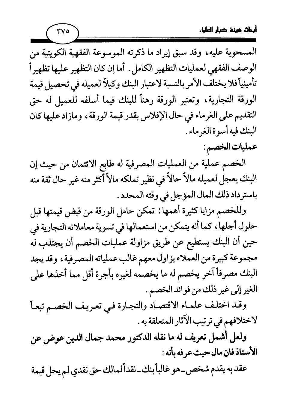 الخصم عملية من العمليات المصرفية له طابع الائتمان من حيث البنك يعجل لعميله مالا حالا في نظير تملكه مالا أكثر منه غير حال ثقة باسترداد ذلك المال المؤجل في وقته المحدد.